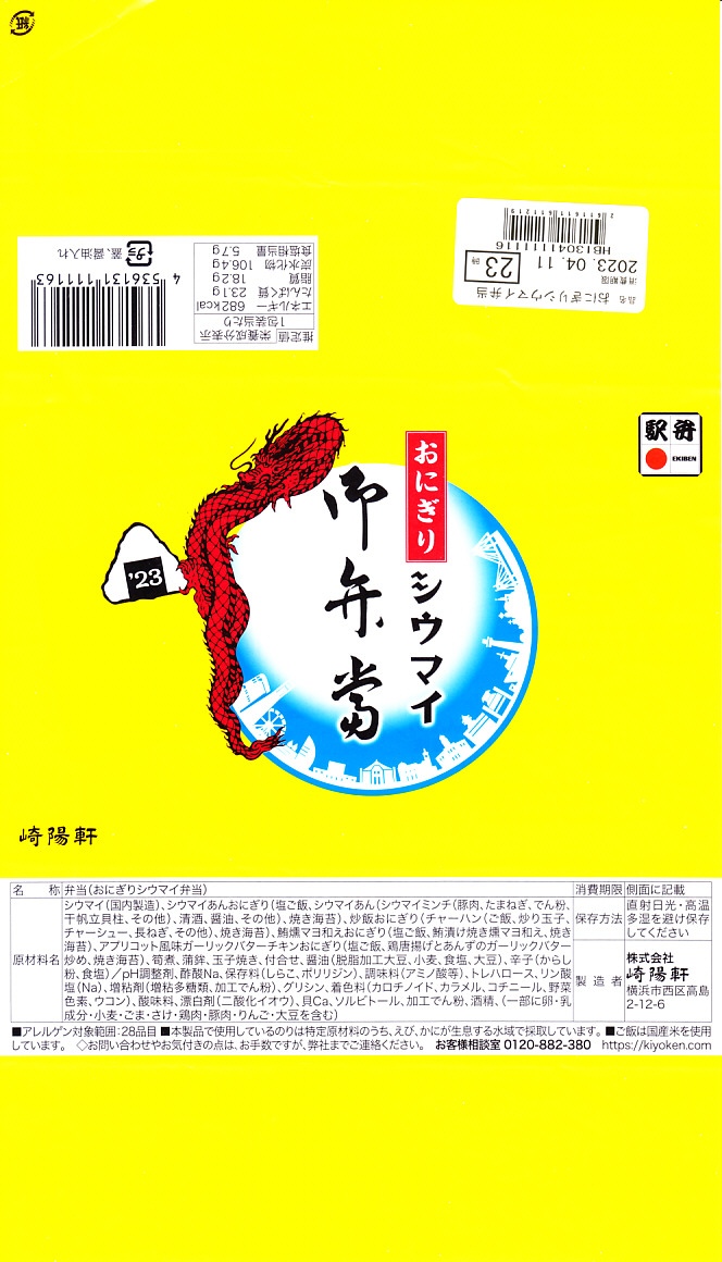 商品名は「おにぎりシウマイ弁当」とも。今回は2023(令和5)年4月10日から12日まで、調製元のネット通販での完全予約制で、140店舗にて4,200個を販売。今回も駅弁の日に合わせ、日本鉄道構内営業中央会の会員のうち26社が、この年の4月10日から各社の駅売店などで販売した、駅弁の日記念のおにぎり駅弁の、横浜駅バージョンとして販売。他社とのタイアップはないが、駅弁カードは付いてきた。