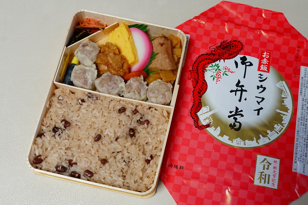 2019(令和元)年5月1日から6月18日まで販売。駅弁の名前のとおり、シウマイ弁当の御飯を赤飯に置き換えたものであり、発売月からの新元号の「令和」を記念するもの。掛紙の絵柄はおおむね通常版と同じで、地色が赤や金になっている。これは2017(平成29)年8月に崎陽軒公式サイト上で実施したアンケート企画「トンデモ!?シウマイ弁当」の、「お赤飯バージョンのシウマイ弁当」の商品化のようにも見える。同年の9月までに、掛紙から「令和」を抜き、5個以上での予約販売を始めた。価格は2019年の発売時や購入時で980円、のち960円、2022年10月から1,000円、2023年10月から1,050円、2025年2月から1,170円、2026年2月から1,280円。
