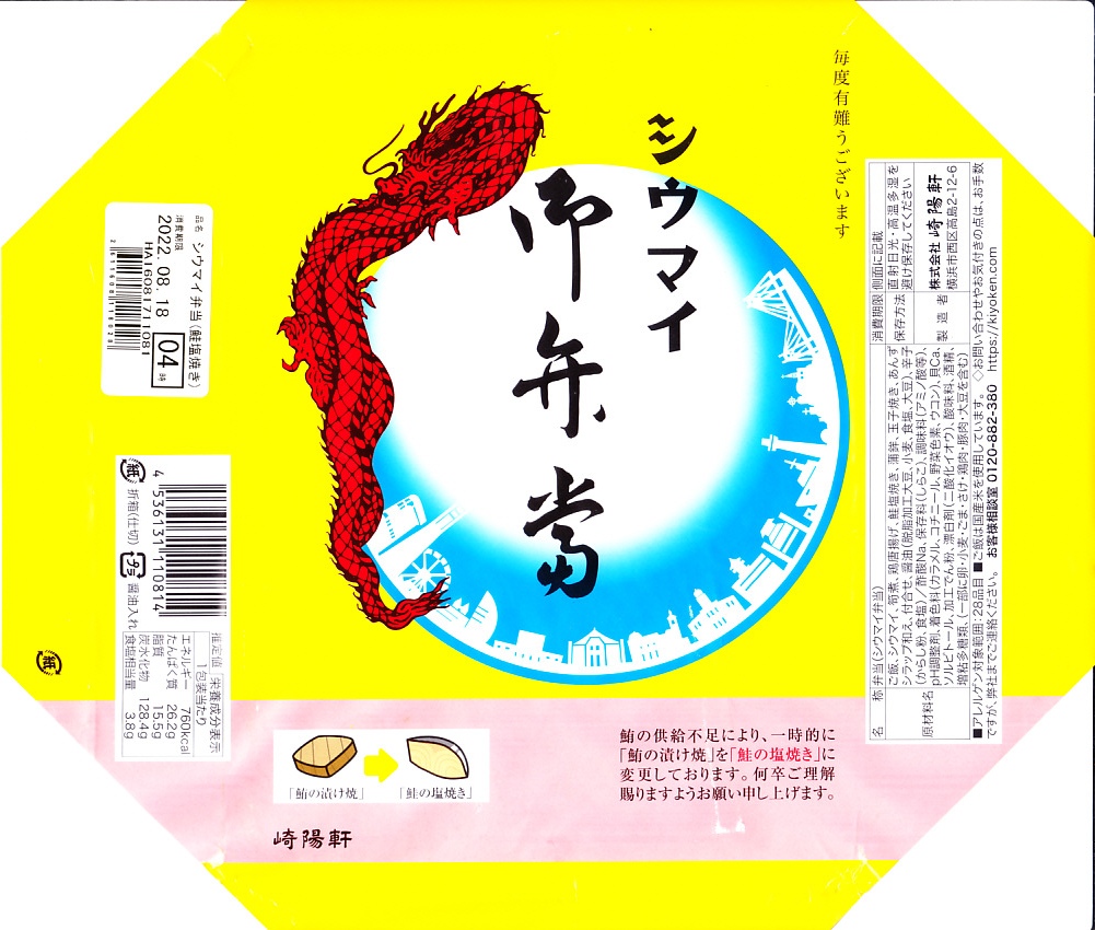 2022(令和4)年8月17日から23日まで販売。普段の駅弁「シウマイ弁当」について、材料の供給不足のためこの1週間だけ、中身から鮪の漬け焼をなくし、鮭の塩焼きを加えた。その事実がイラスト付きで掛紙に記され、シールを貼るなどでなく刷り直して使われた。たしかによく見ると、中身のマグロがサケに替わっている。小粒の鮭塩焼はまるでタラか銀ムツのような脂と弾力を持ち、駅弁のサケでは出色の出来映えだと感じたが、ネット上の感想ではあの固くて醤油辛いマグロのほうがよいという意見が多かったように見えた。たしかに飯のおかずや酒のつまみには、サケよりマグロが向いていると思う。