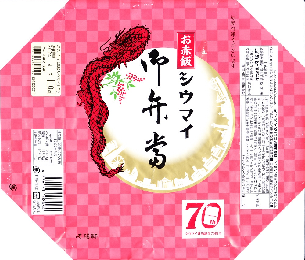 2024(令和6)年4月2日に購入した、横浜駅弁の掛紙。シウマイ弁当誕生70周年企画として、2024年4月1日から7日まで、普段は5個以上の予約販売を行うお赤飯シウマイ弁当の掛紙に70周年オリジナルロゴを追加し、崎陽軒の店舗で予約を要せず1個から販売した。1個からの予約もできた。それ以外は、通常版と同じ。