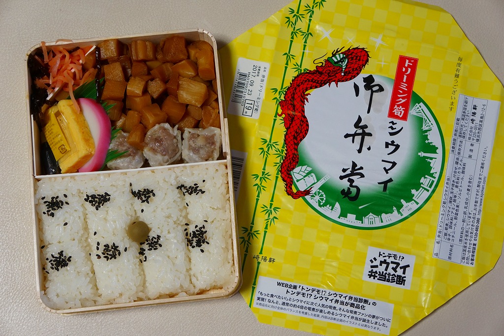 なお、「トンデモ!?シウマイ弁当」における「ドリーミング筍シウマイ弁当」の中身は、上の写真のようなものであった。商品化にあたり、内容を一部変更したという。
