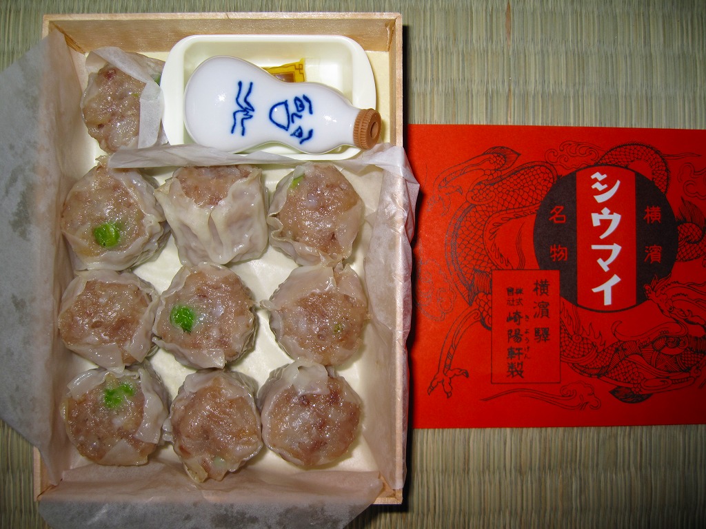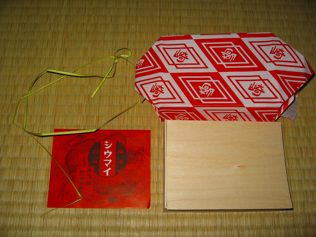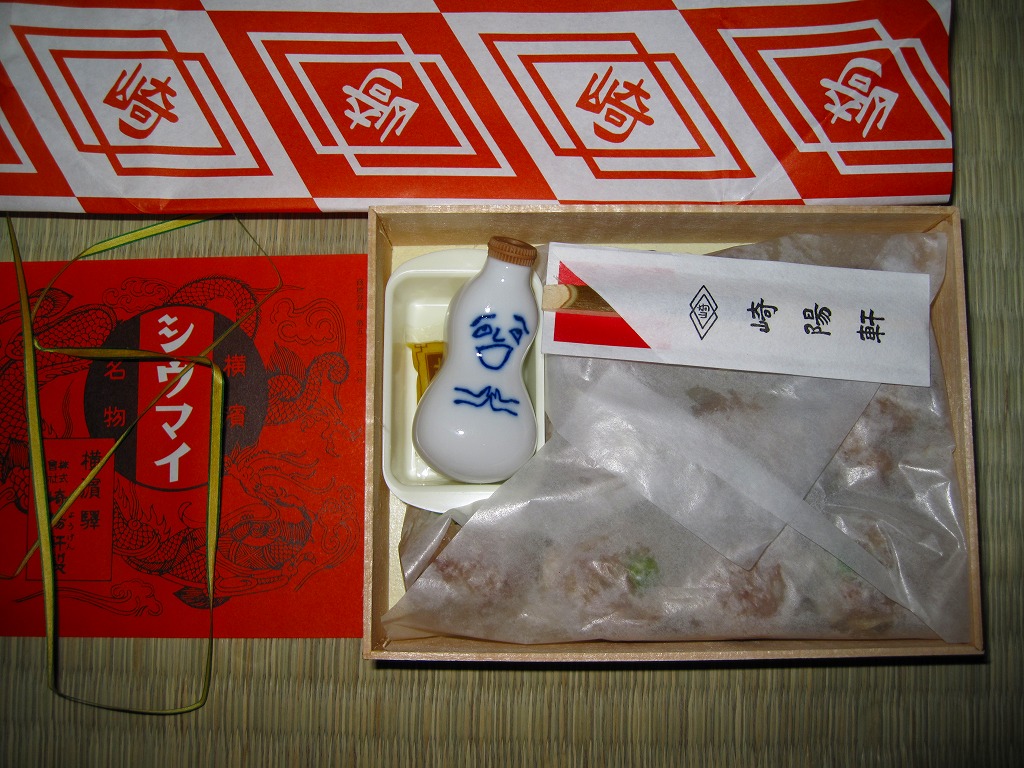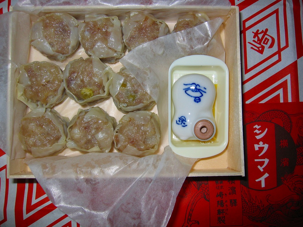 小さな経木の容器を、当時の調製元のロゴマークを印刷した包装紙で包み、今もデザインは変わらない掛紙をかけて、紙ひもでしばる。中身はいつものシウマイの10個入り。名物の醤油入れ「ひょうちゃん」とその受けとマスタードは現行品が付いていたが、そこまで復刻させるのは酷だろう。安全上の理由でもうここでは不可能と思われてきた立ち売りを再現しただけでも、鉄道会社と駅弁屋の英断に感謝したい。