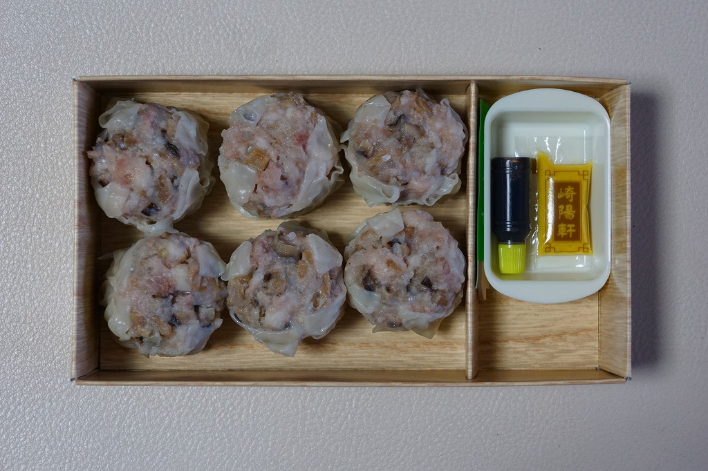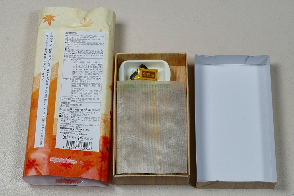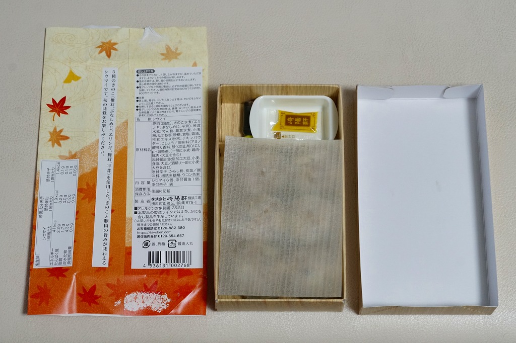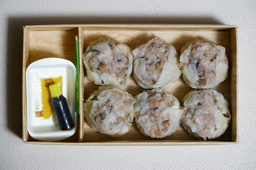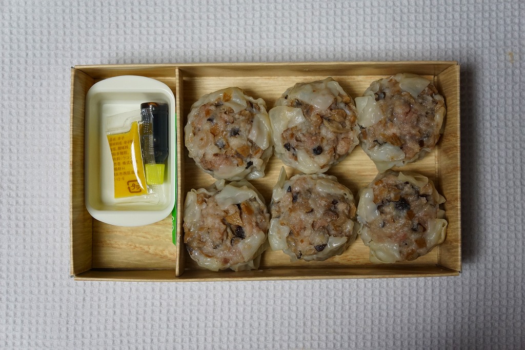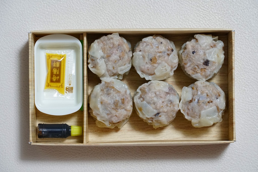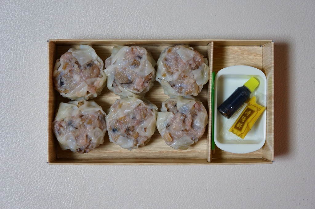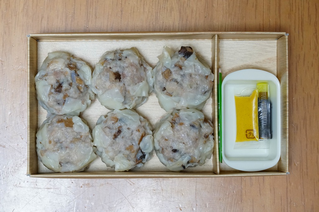 シイタケ、エリンギ、ぶなしめじ、ヒラタケと豚肉を混ぜ合わせた、中華の点心としては通常サイズ、崎陽軒の横浜駅弁としては大きいサイズのシウマイを、木目柄の紙箱に6個収め、醤油と辛子を添える。