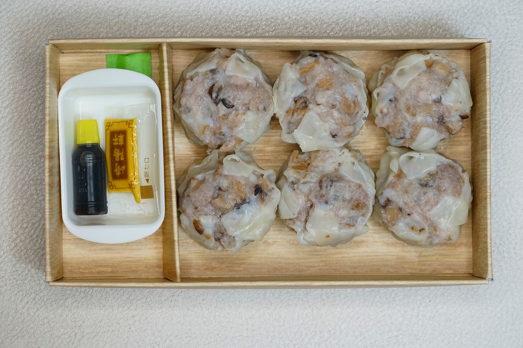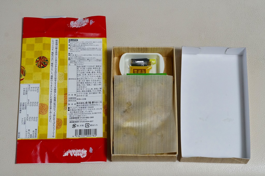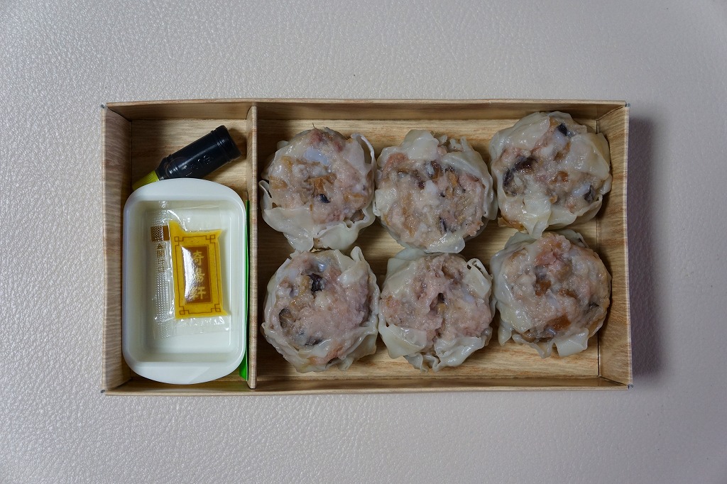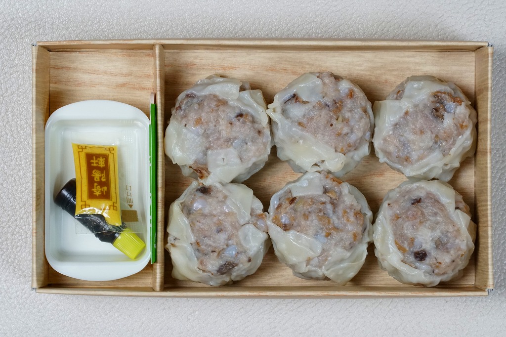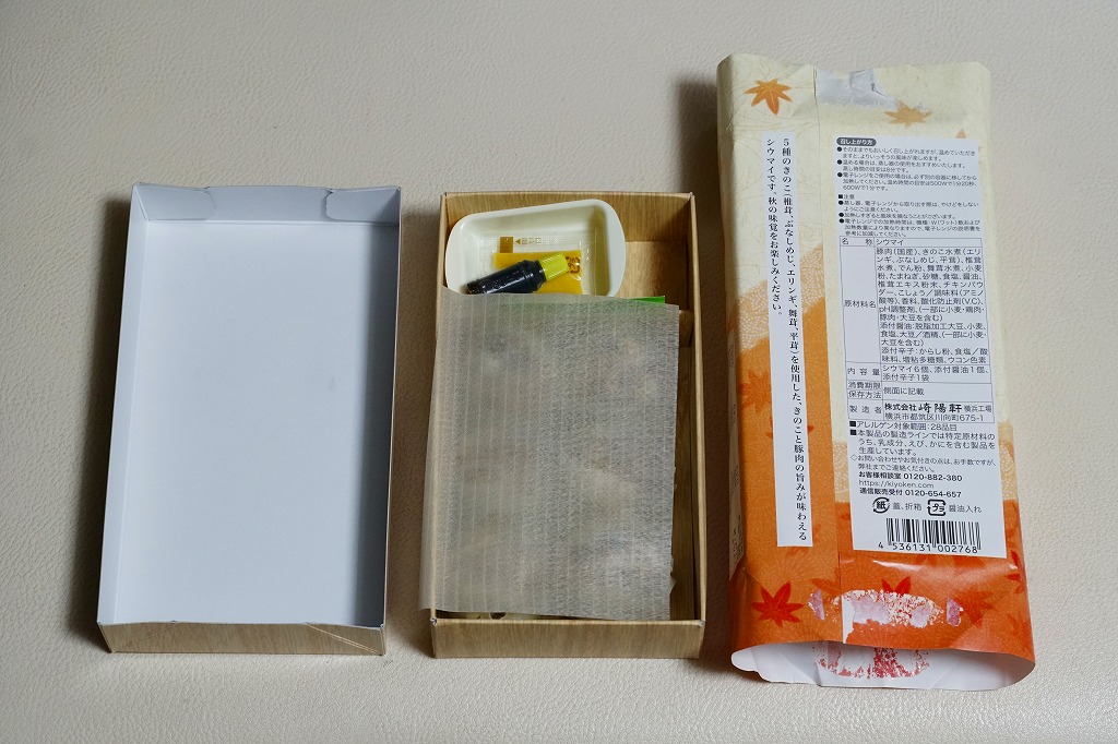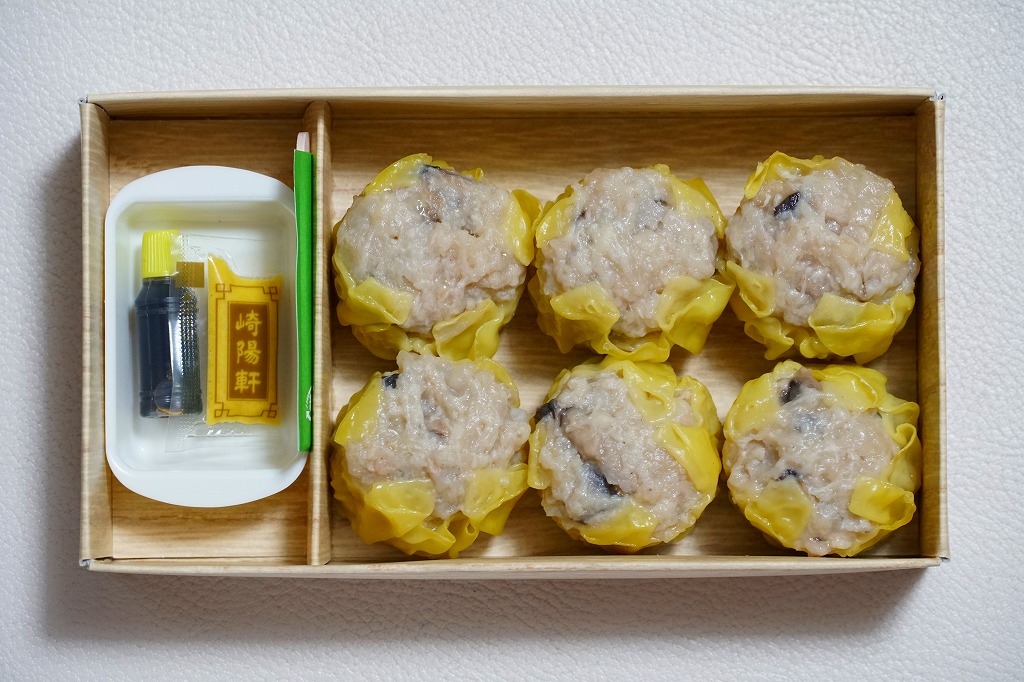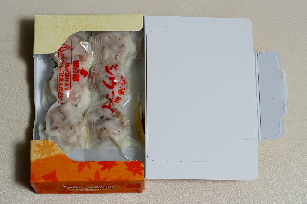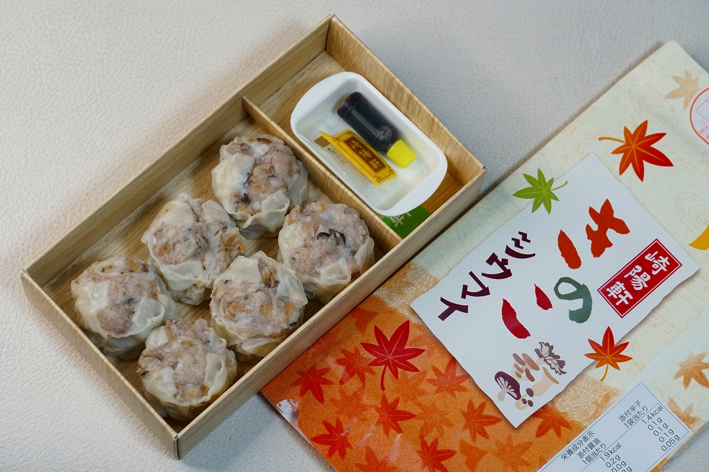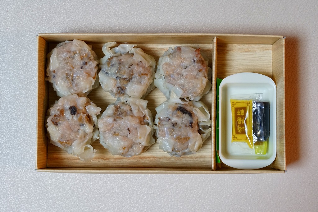 シイタケ、エリンギ、ぶなしめじ、ヒラタケと豚肉を混ぜ合わせた、中華の点心としては通常サイズ、崎陽軒の横浜駅弁としては大きいサイズのシウマイを、木目柄の紙箱に6個収め、醤油と辛子を添える。