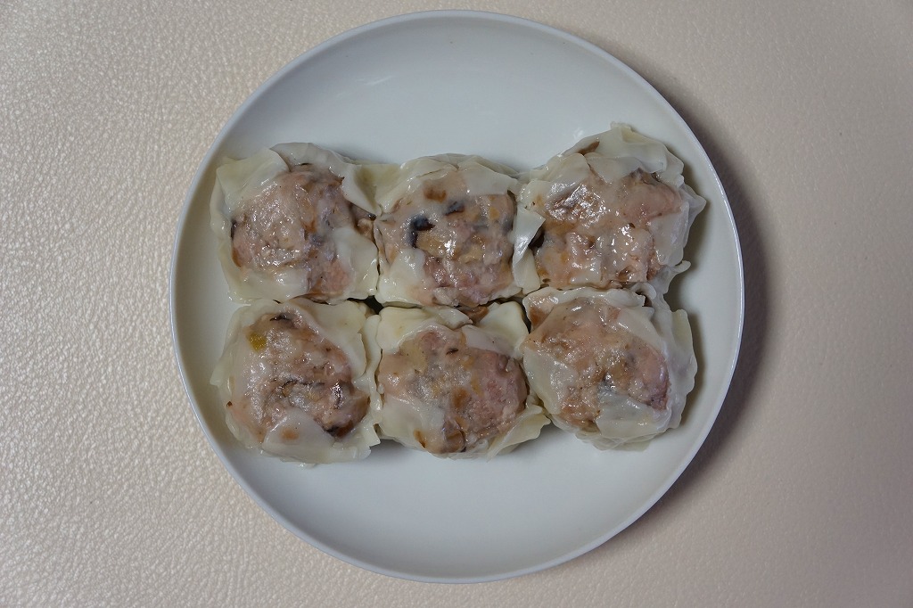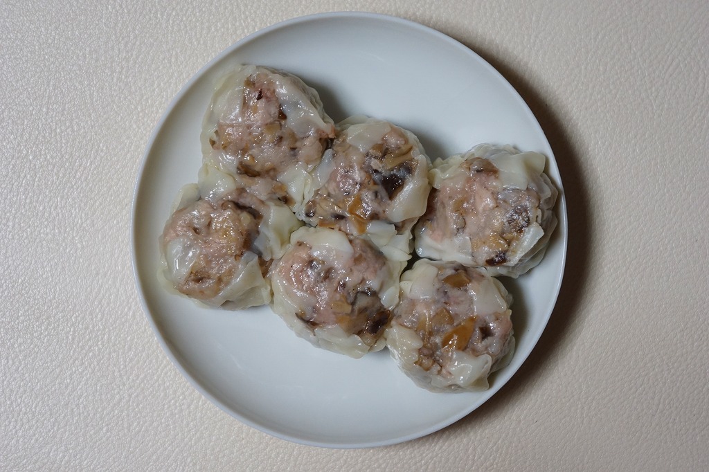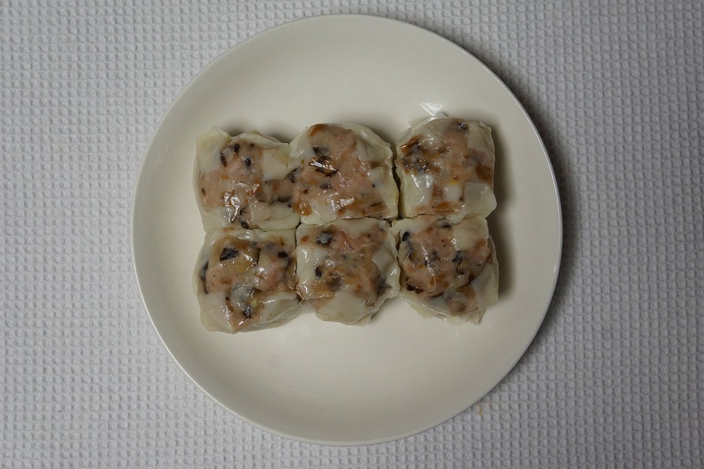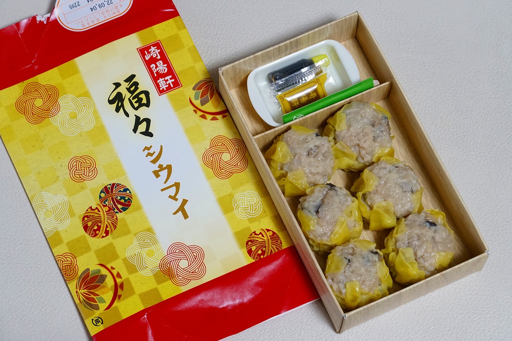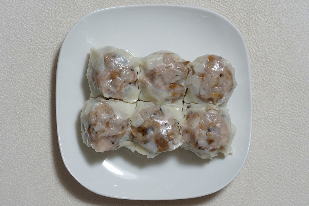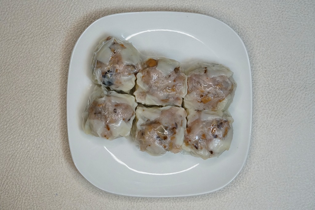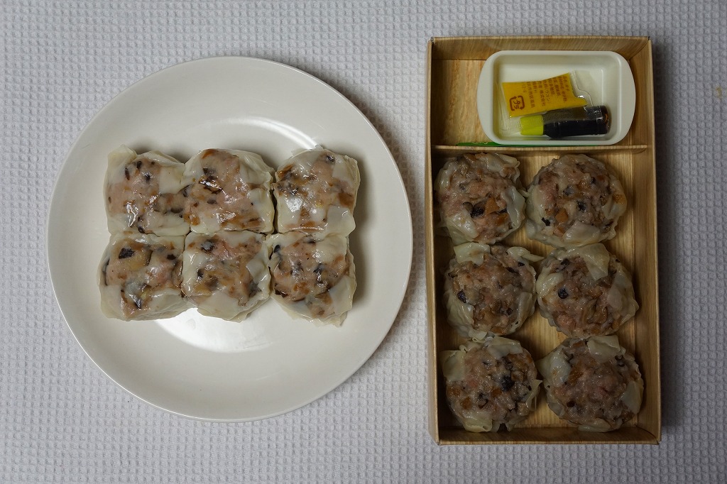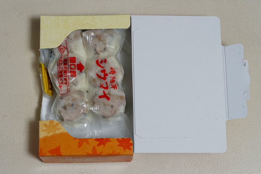 シイタケ、エリンギ、ぶなしめじ、ヒラタケと豚肉を混ぜ合わせた、中華の点心としては通常サイズ、崎陽軒の横浜駅弁としては大きいサイズのシウマイを、木目柄の紙箱に6個収め、醤油と辛子を添える。
