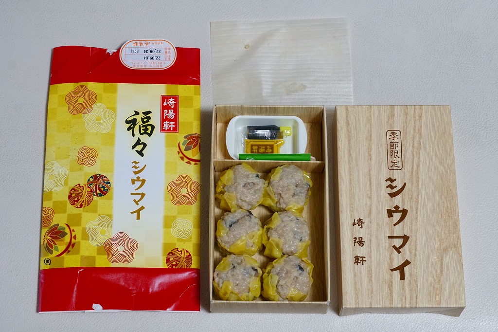 2003(平成15)年に発売された、季節の特製シウマイの秋版。今回も「きのこシウマイ」の、この常温タイプと「おいしさ長もちシリーズ」の両方を、2025(令和7)年9月1日から11月30日まで併売。折箱も包装紙も中身も風味も前年と同じで、実質的に13年連続で据え置かれた。しいたけ、ぶなしめじ、エリンギ、舞茸、ヒラタケと豚肉を混ぜ合わせた、中華の点心としては通常サイズ、崎陽軒の横浜駅弁としては大きいサイズのシウマイを、木目柄の紙箱に6個収め、醤油と辛子を添える。味も13年連続で据え置きか。価格も据え置かれた。