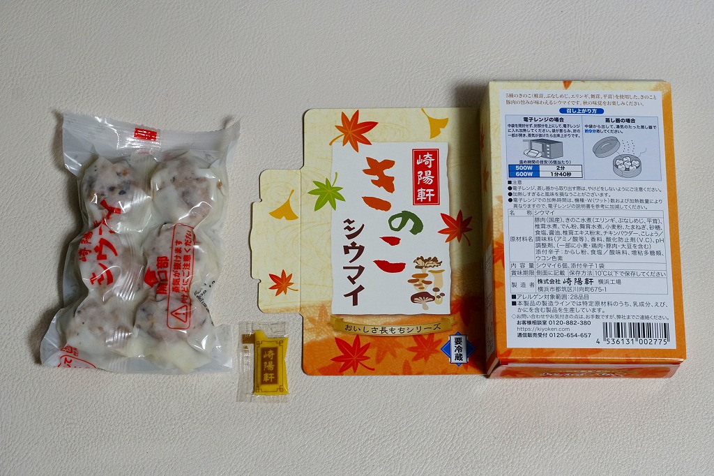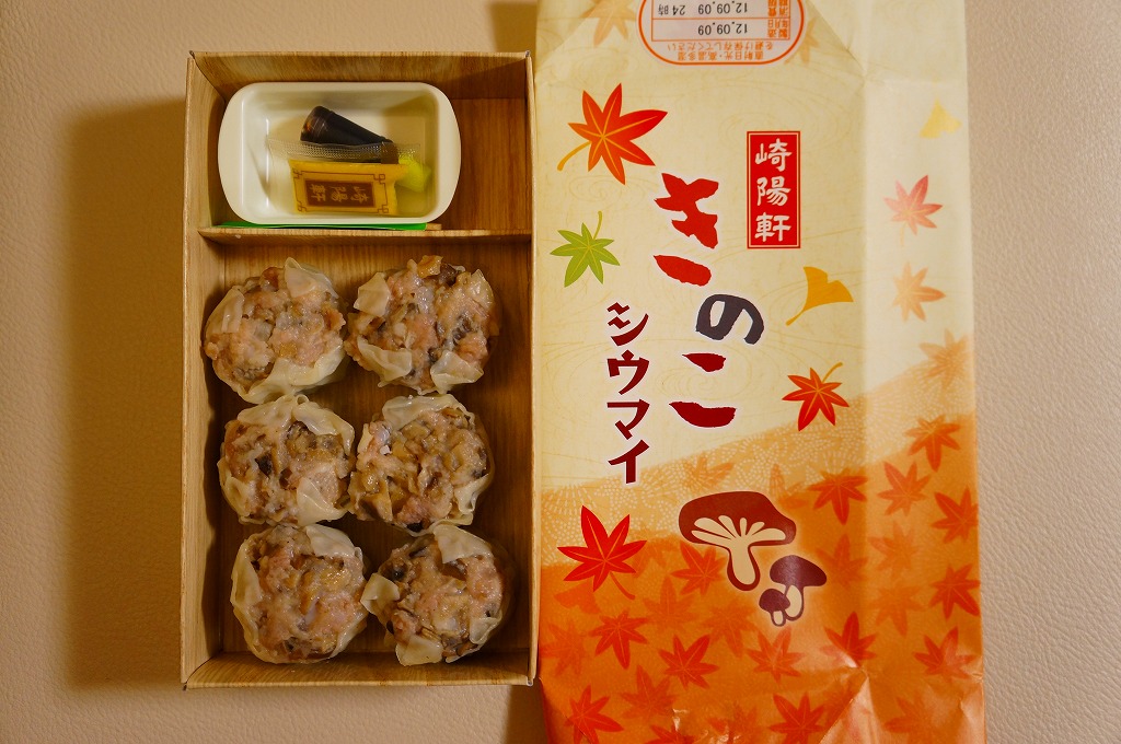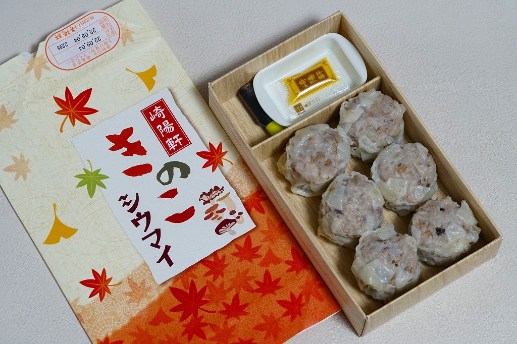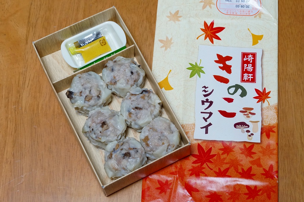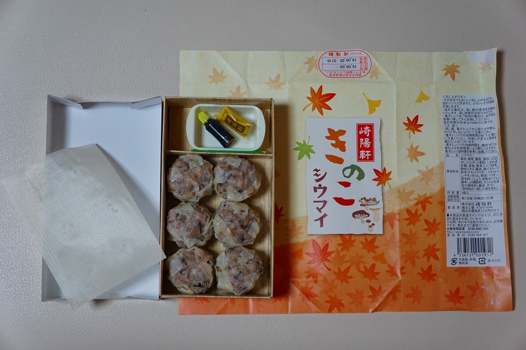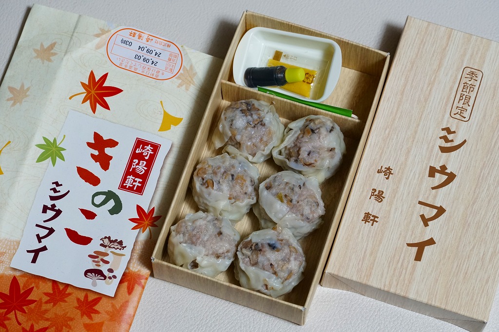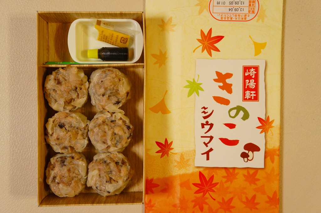 2003(平成15)年に発売された、季節の特製シウマイの秋版。今回も「きのこシウマイ」の、この常温タイプと「おいしさ長もちシリーズ」の両方を、2024(令和6)年9月1日から11月30日まで併売。折箱も包装紙も中身も風味も前年と同じで、実質的に12年連続で据え置かれた。しいたけ、ぶなしめじ、エリンギ、舞茸、ヒラタケと豚肉を混ぜ合わせた、中華の点心としては通常サイズ、崎陽軒の横浜駅弁としては大きいサイズのシウマイを、木目柄の紙箱に6個収め、醤油と辛子を添える。味も12年連続で据え置きか。価格は20円上がった。