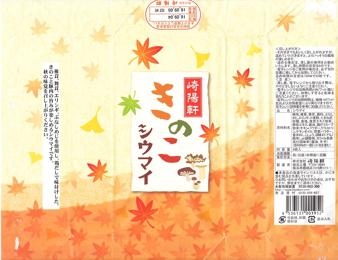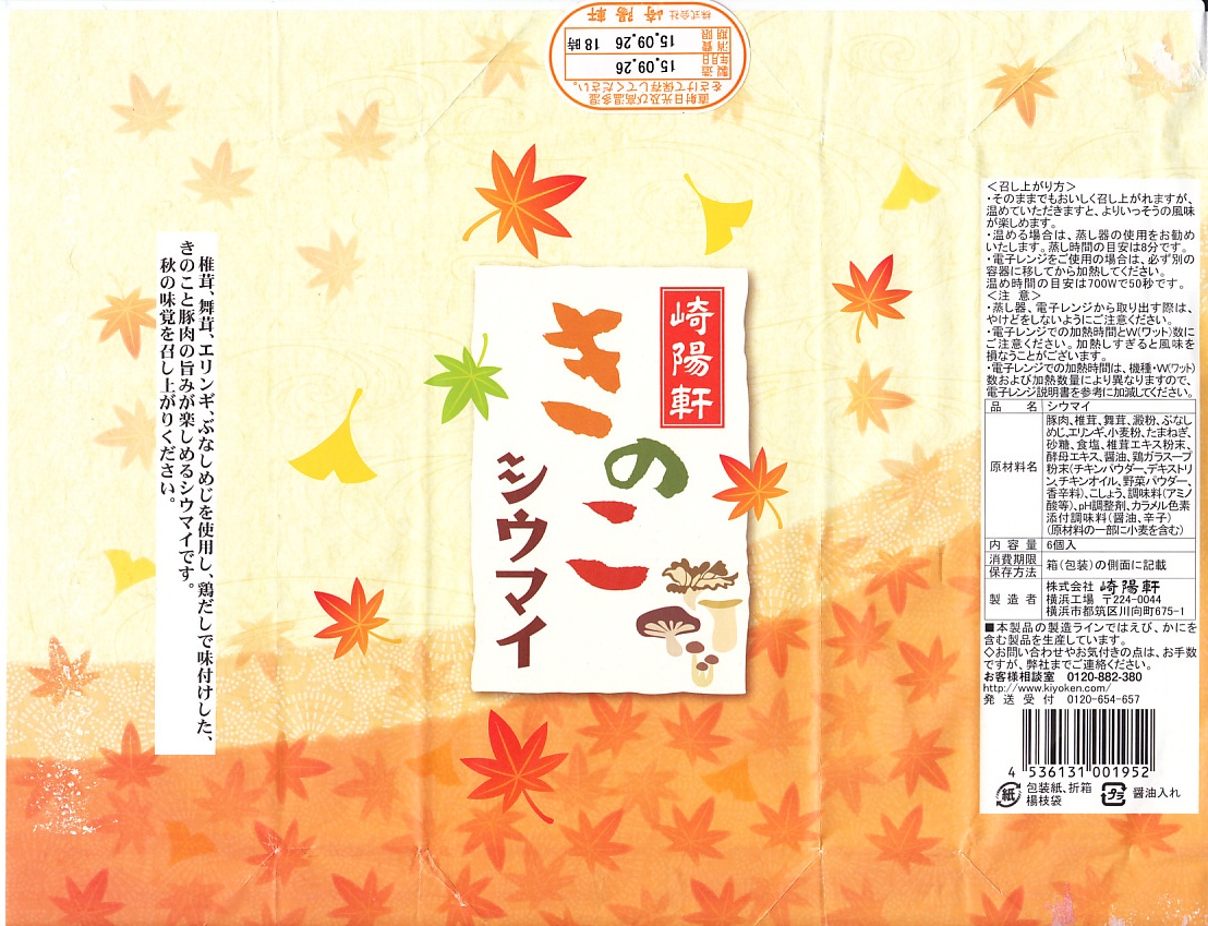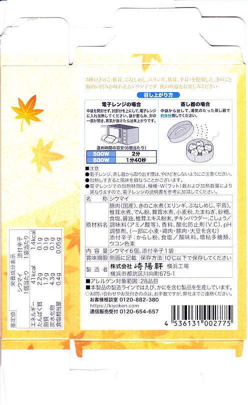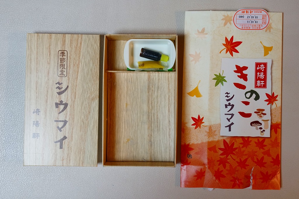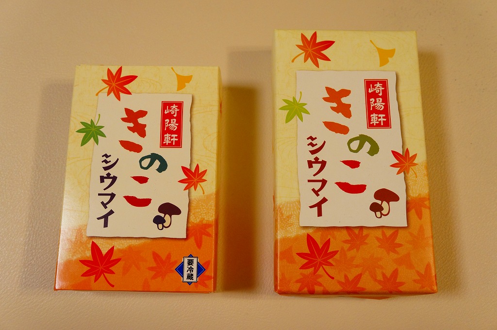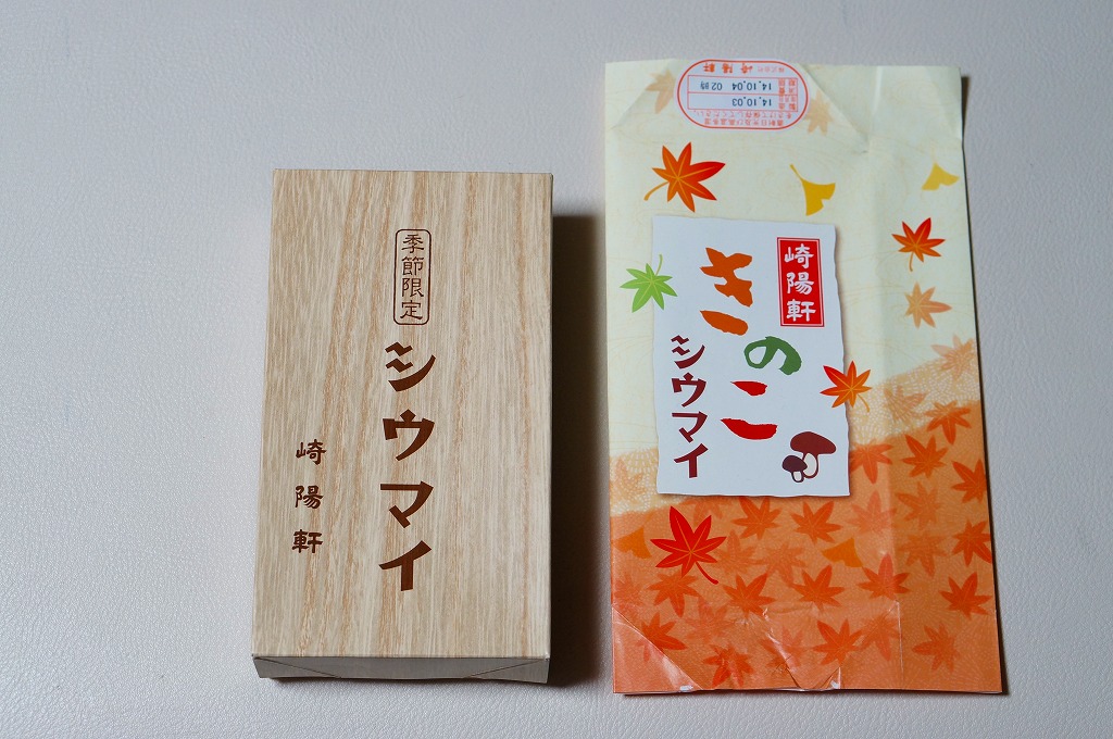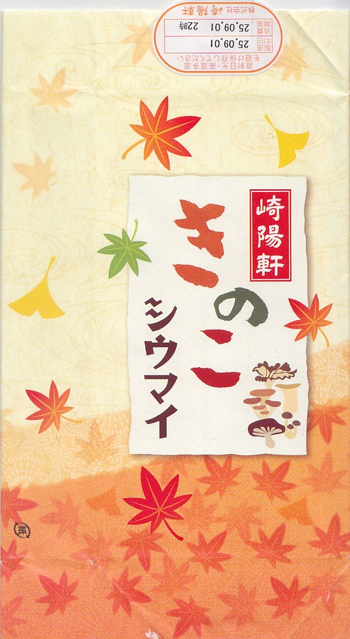 2003(平成15)年に発売された、季節の特製シウマイの秋版。今回も「きのこシウマイ」の、この常温タイプと「おいしさ長もちシリーズ」の両方を、2020(令和2)年9月1日から11月30日まで併売。折箱も包装紙も中身も風味も、前年とまったく同じで、実質的に8年連続で据え置かれた。