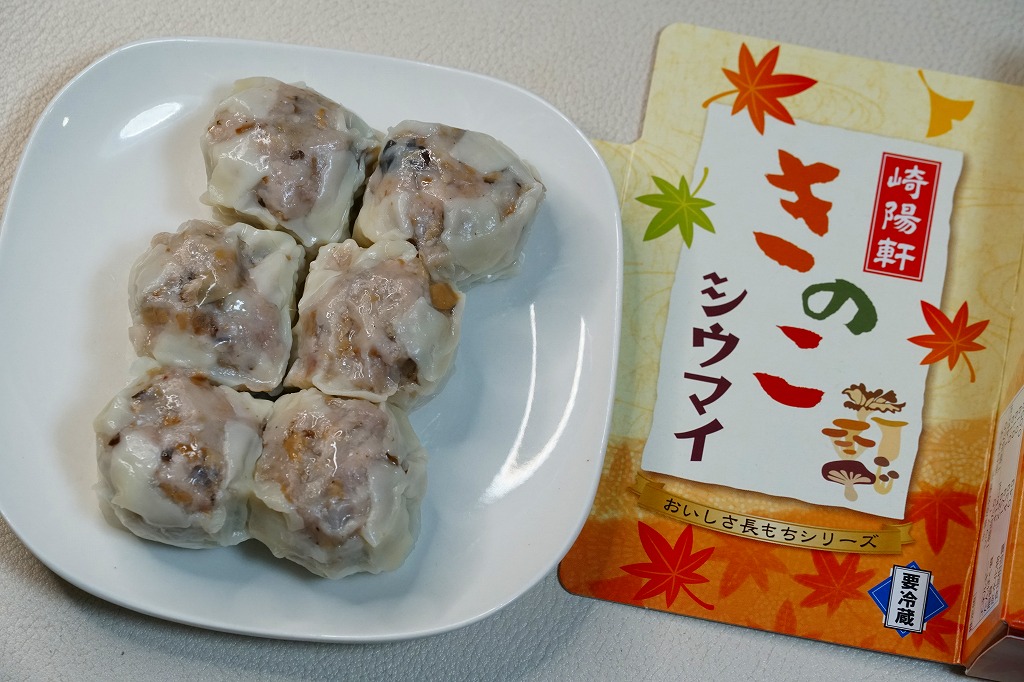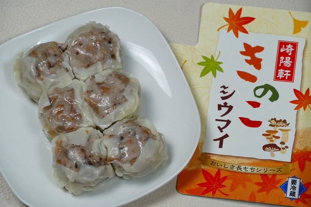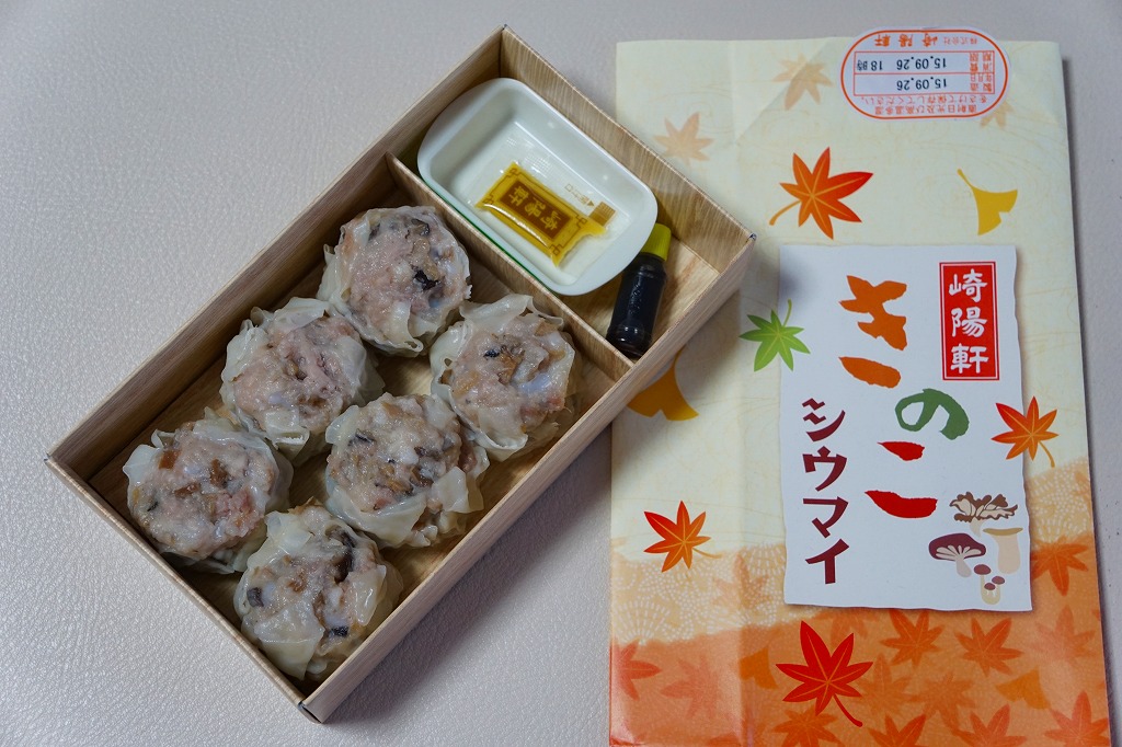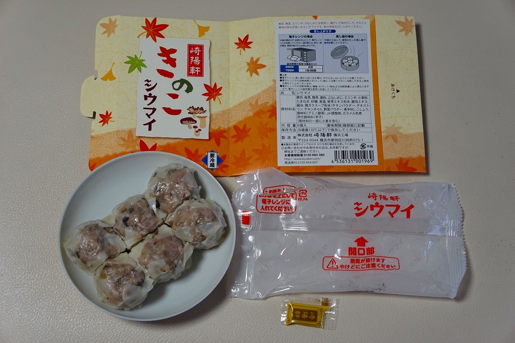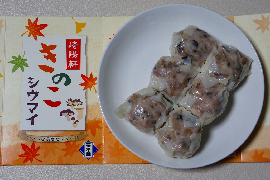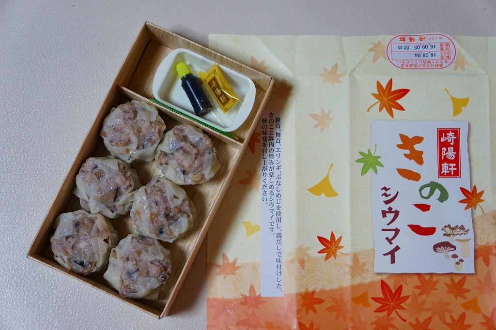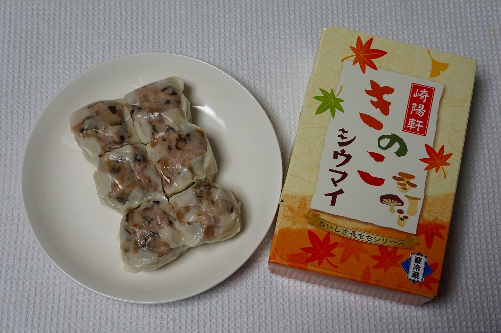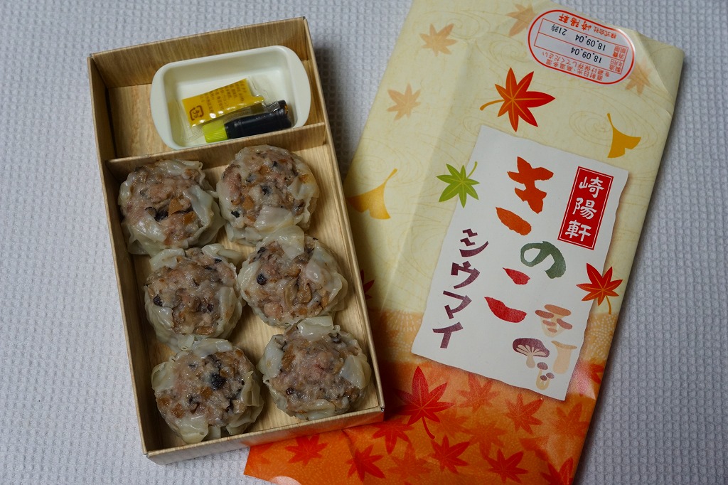 2003(平成15)年に発売された、季節の特製シウマイの秋版。今回も「きのこシウマイ」の、常温タイプとこの「おいしさ長もちシリーズ」の両方を、2024(令和6)年9月1日から11月30日まで併売。折箱も包装紙も中身も風味も前年と同じで、実質的に12年連続で据え置かれた。しいたけ、ぶなしめじ、エリンギ、舞茸、ヒラタケと豚肉を混ぜ合わせた、中華の点心としては通常サイズ、崎陽軒の横浜駅弁としては大きいサイズのシウマイを、樹脂の袋で押し潰して箱に詰め、辛子を添える。味も12年連続で据え置きか。価格は20円上がった。