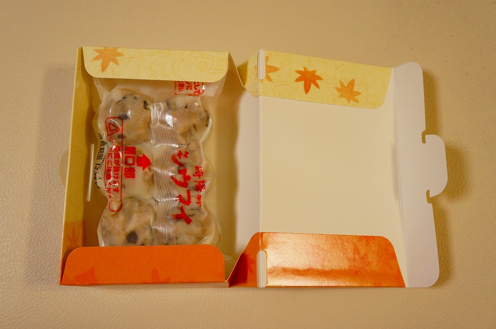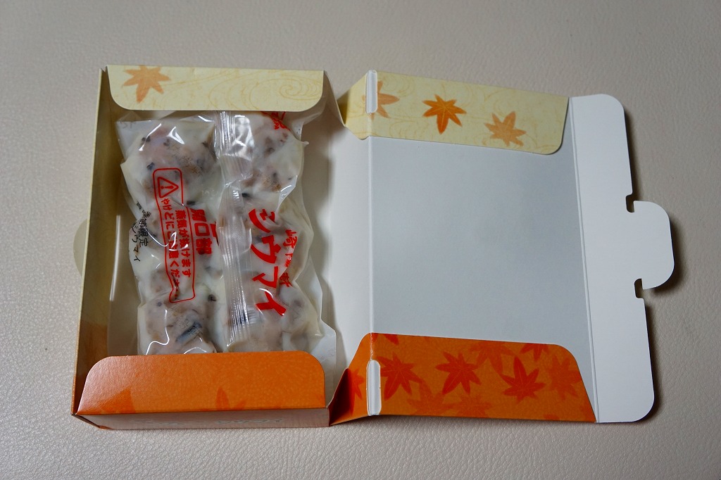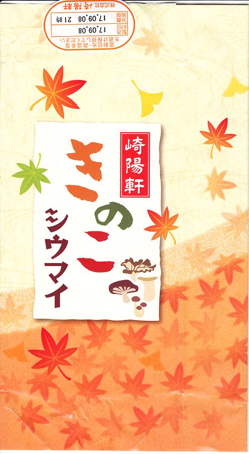 2018(平成30)年9月1日から11月30日までの販売の、秋の特製シウマイ。今回も引き続き、常温タイプと「おいしさ長もちシリーズ」の販売で、こちらは前者の常温タイプ。包装紙も紙箱も中身も味も、6年連続で据え置かれたと思ったら、今回はシウマイに混ぜたきのこが「椎茸、エリンギ、ぶなしめじ、ひらたけ」であり、舞茸が消えてひらたけが加わった。見ても食べても気が付かない差異。価格は20円のアップ。