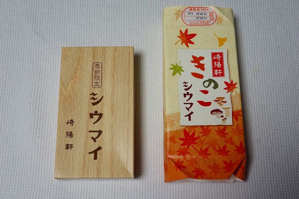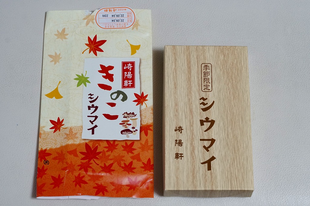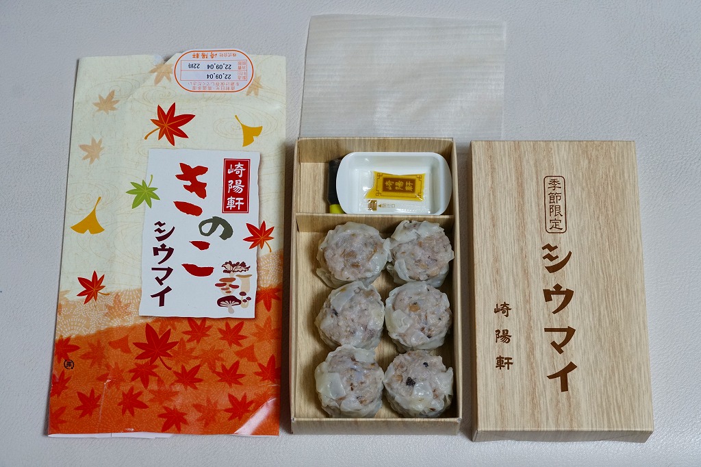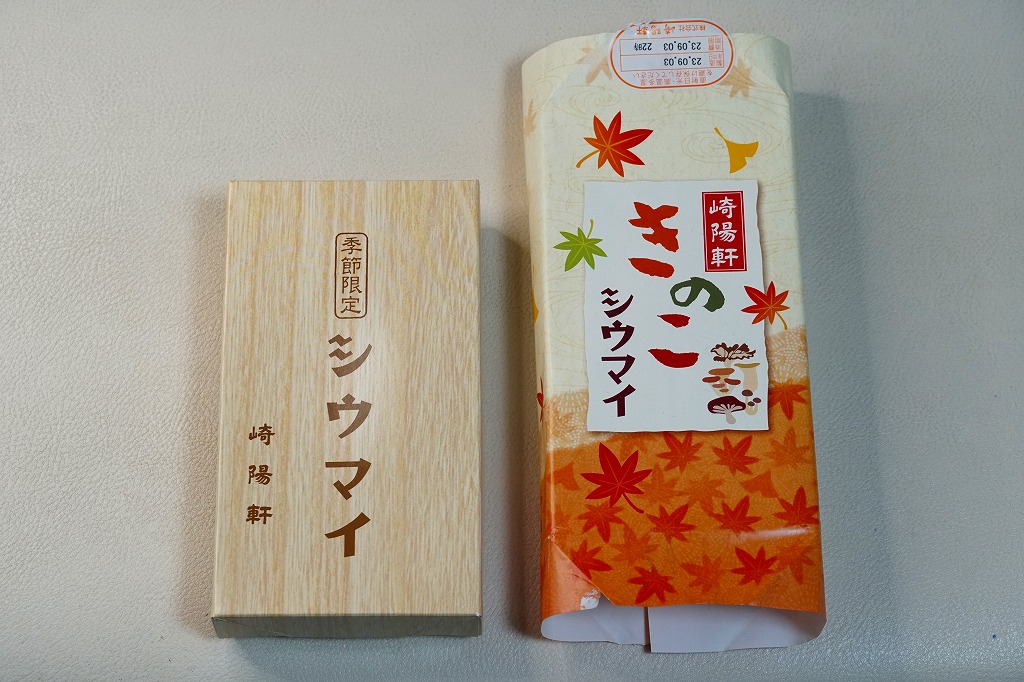 2003(平成15)年に発売された、季節の特製シウマイの秋版。今回も「きのこシウマイ」の、常温タイプとこの「おいしさ長もちシリーズ」の両方を、2023(令和5)年9月1日から11月30日まで併売。折箱も包装紙も中身も風味も前年と同じで、実質的に11年連続で据え置かれた。しいたけ、ぶなしめじ、エリンギ、舞茸、ヒラタケと豚肉を混ぜ合わせた、中華の点心としては通常サイズ、崎陽軒の横浜駅弁としては大きいサイズのシウマイを、樹脂の袋で押し潰して箱に詰め、辛子を添える。味も11年連続で据え置きか。価格は30円上がった。