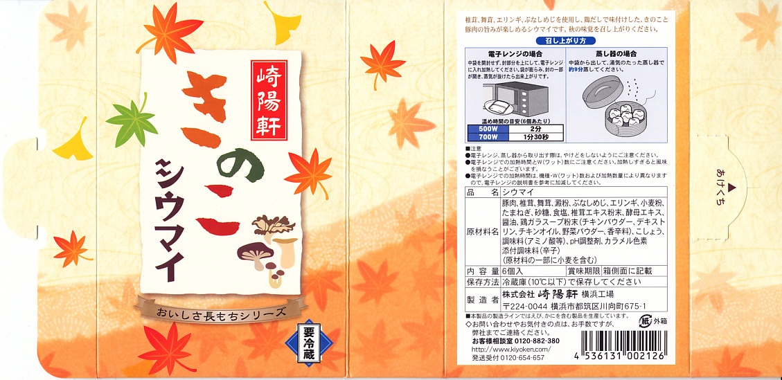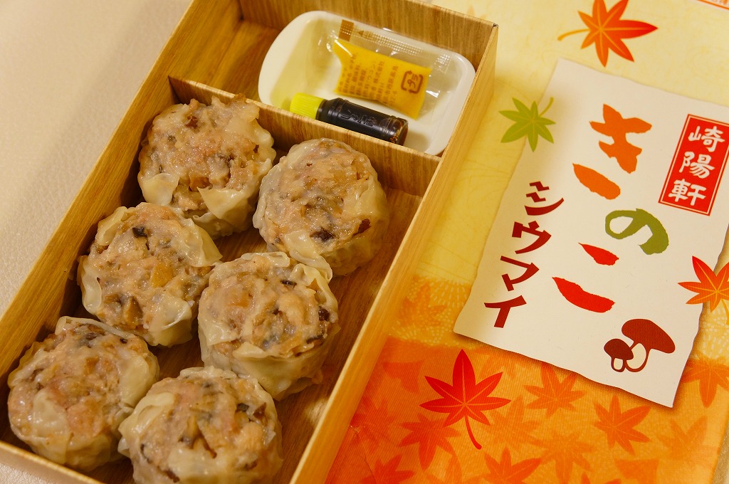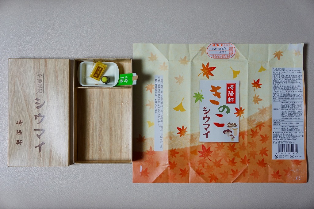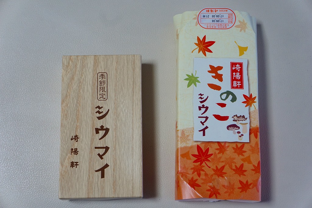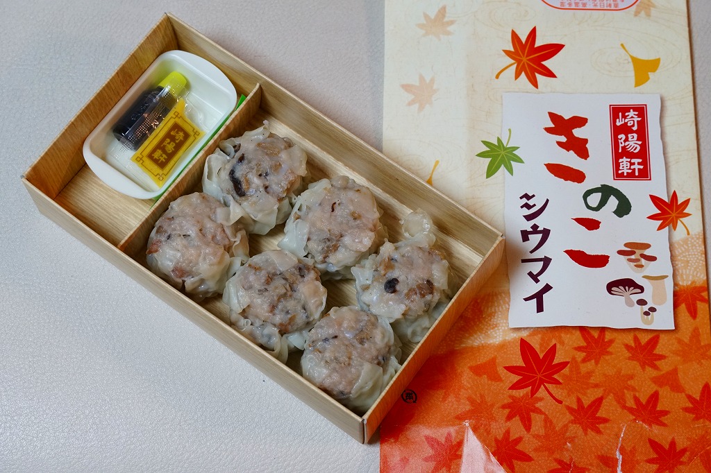 2003(平成15)年に発売された、季節の特製シウマイの秋版。今回も「きのこシウマイ」の、常温タイプとこの「おいしさ長もちシリーズ」の両方を、2023(令和5)年9月1日から11月30日まで併売。折箱も包装紙も中身も風味も前年と同じで、実質的に11年連続で据え置かれた。しいたけ、ぶなしめじ、エリンギ、舞茸、ヒラタケと豚肉を混ぜ合わせた、中華の点心としては通常サイズ、崎陽軒の横浜駅弁としては大きいサイズのシウマイを、樹脂の袋で押し潰して箱に詰め、辛子を添える。味も11年連続で据え置きか。価格は30円上がった。