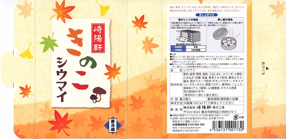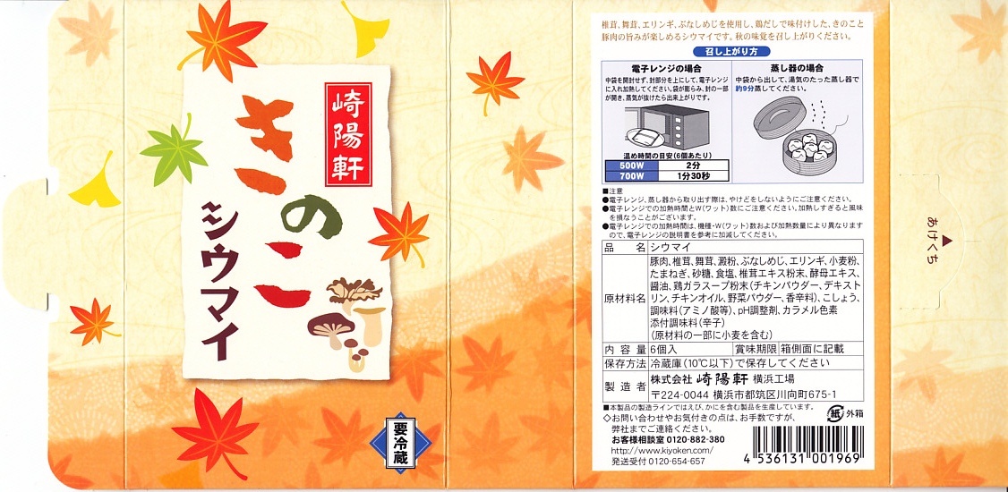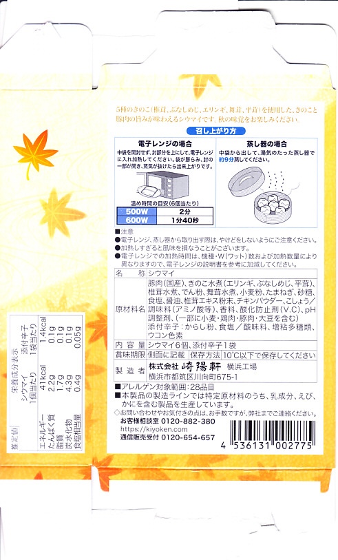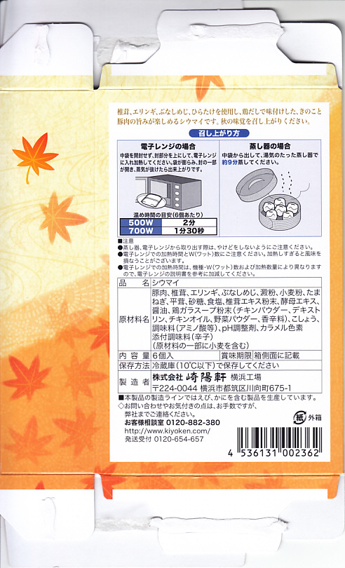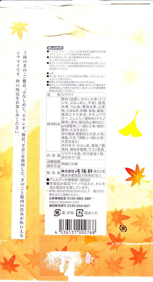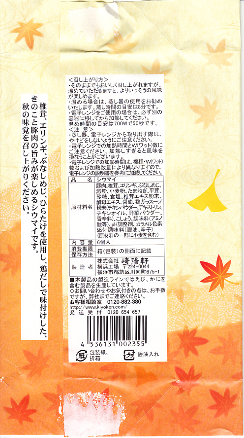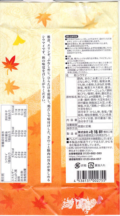 2014(平成26)年9月1日から11月30日までの販売の、秋の特製シウマイ。今回も引き続き、常温タイプと「おいしさ長もちシリーズ」の販売で、こちらは後者の冷蔵タイプ。紙箱も中身も味も据え置かれた。相変わらず、みずみずしいキノコが香る、うまいシウマイ。