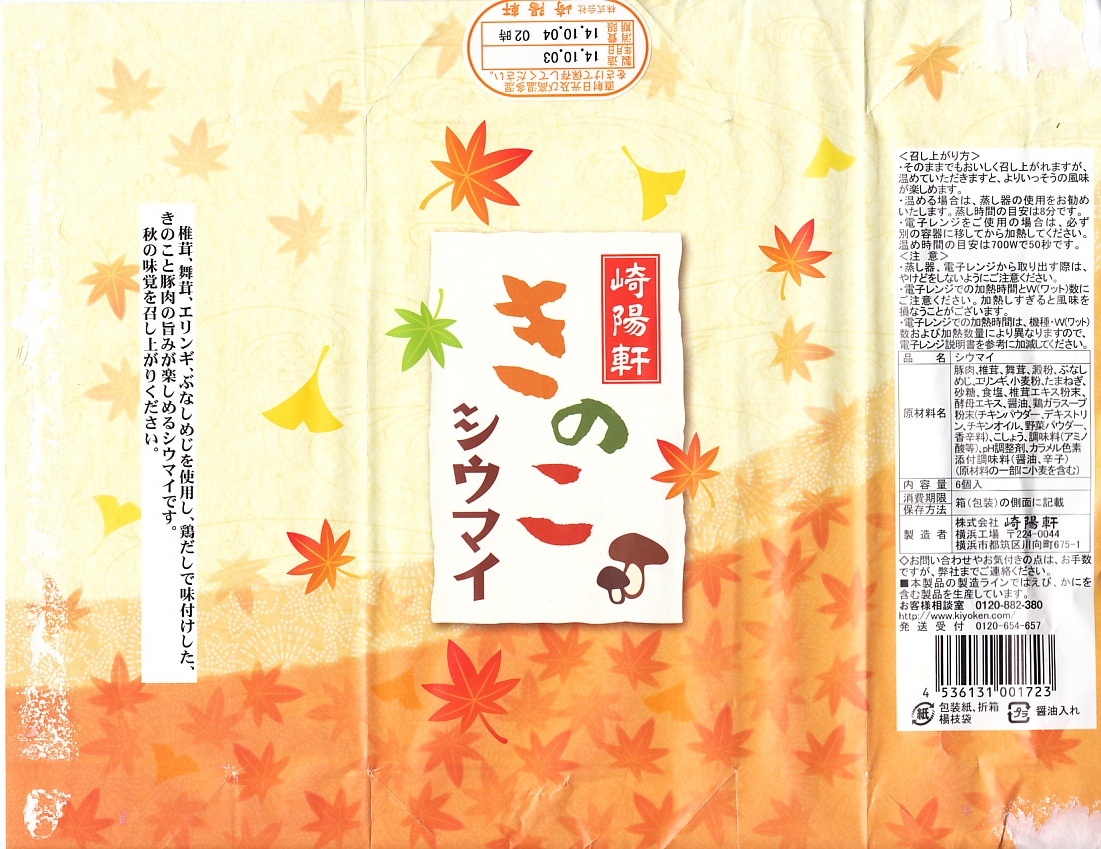 2014(平成26)年9月1日から11月30日までの販売の、秋の特製シウマイ。今回も引き続き、常温タイプと「おいしさ長もちシリーズ」の販売で、こちらは前者の常温タイプ。包装紙も紙箱も中身も味も据え置かれた。一般に焼売は、冷めたり冷たいよりは暖かいほうが好まれると思うが、このきのこシウマイに限っては、常温版を冷たくしてシャキシャキにしたほうがうまいと考えている。