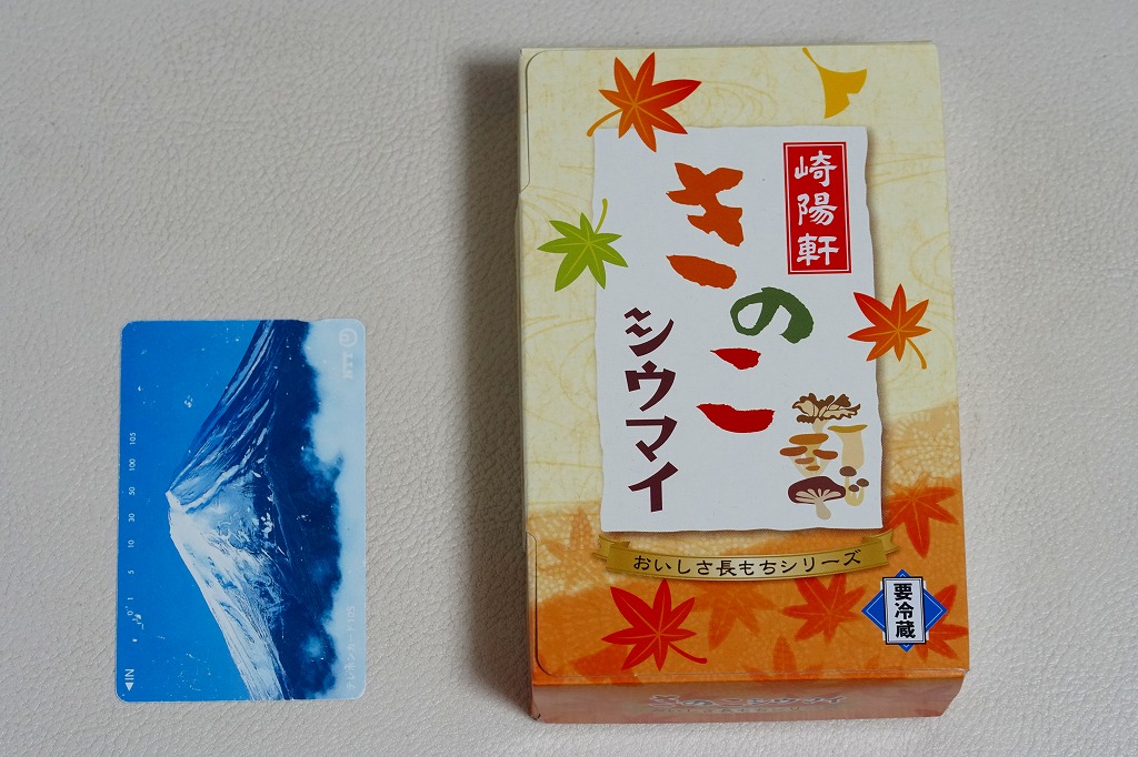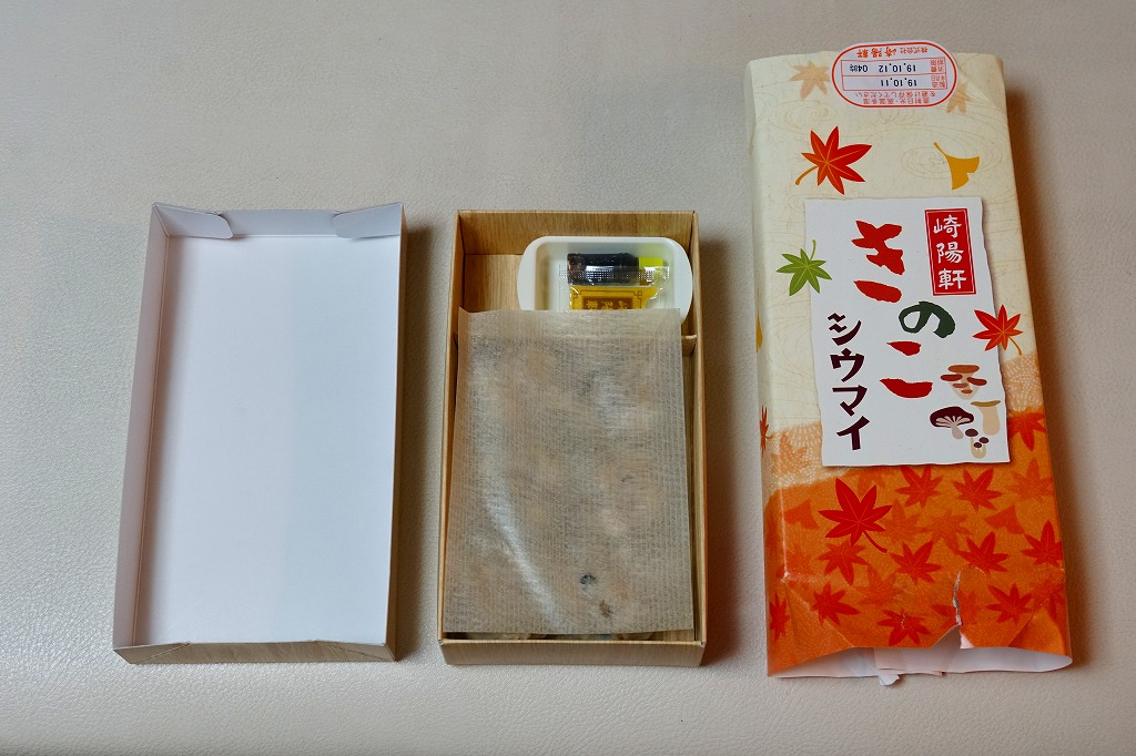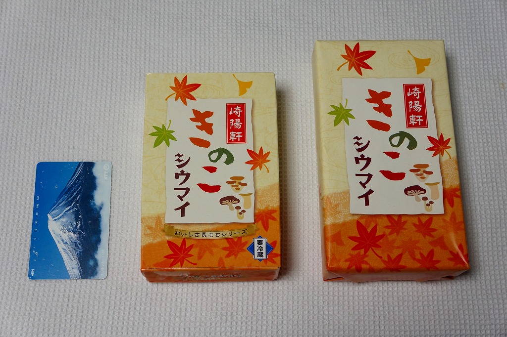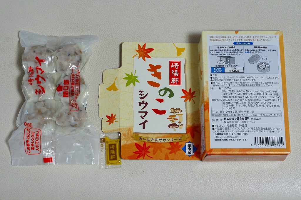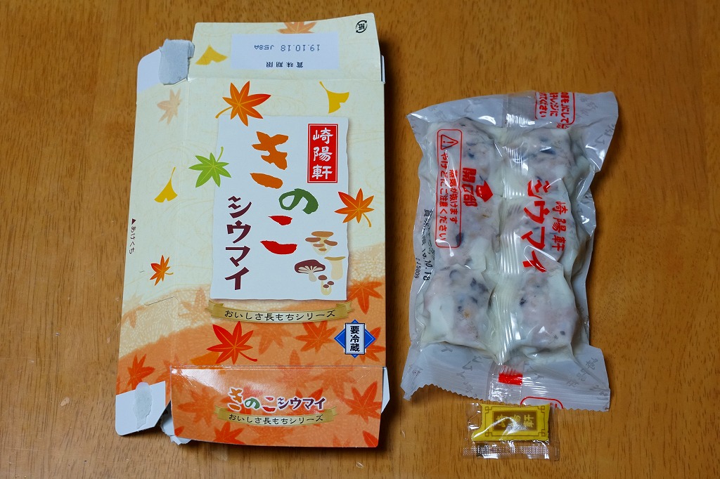 2003(平成15)年に発売された、季節の特製シウマイの秋版。今回も「きのこシウマイ」の、常温タイプとこの「おいしさ長もちシリーズ」の両方を、2025(令和7)年9月1日から11月30日まで併売。折箱も包装紙も中身も風味も前年と同じで、実質的に13年連続で据え置かれた。しいたけ、ぶなしめじ、エリンギ、舞茸、ヒラタケと豚肉を混ぜ合わせた、中華の点心としては通常サイズ、崎陽軒の横浜駅弁としては大きいサイズのシウマイを、樹脂の袋で押し潰して箱に詰め、辛子を添える。味も13年連続で据え置きか。価格も据え置かれた。