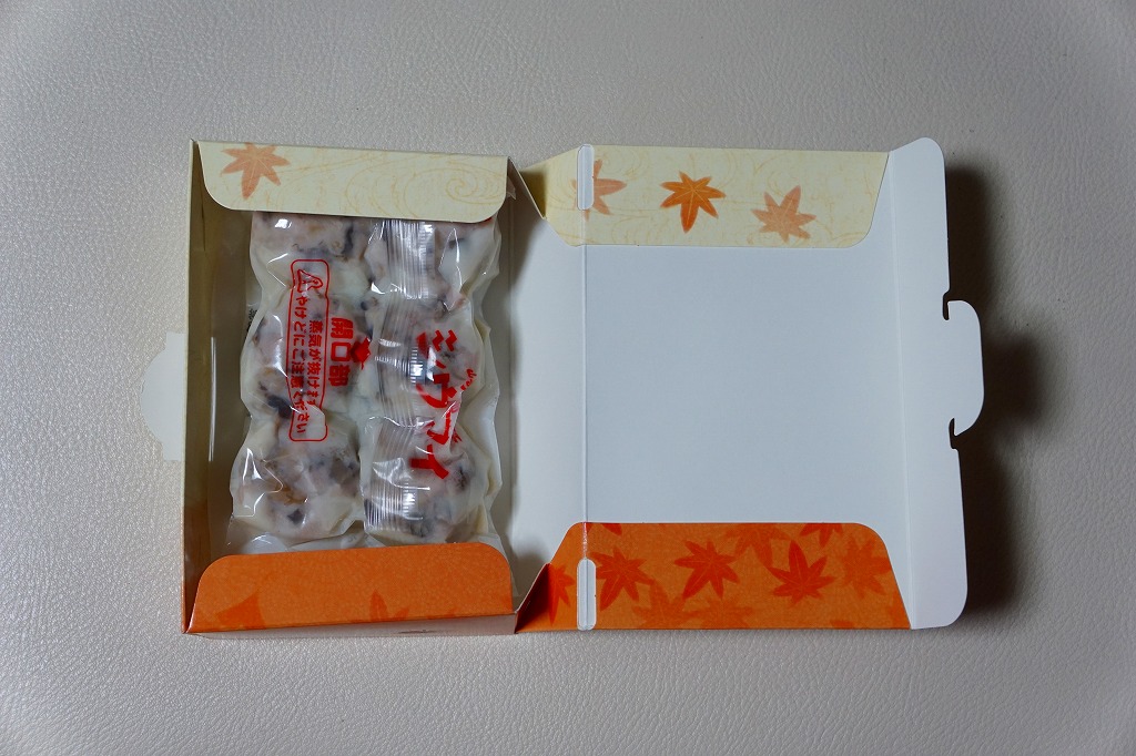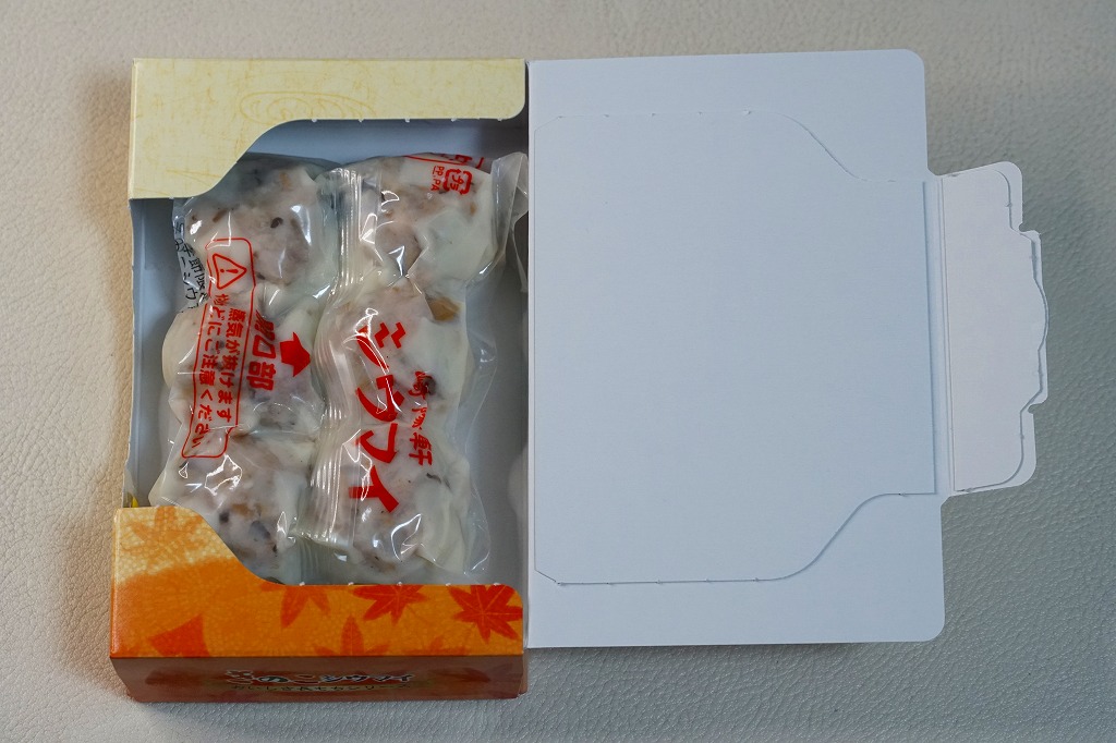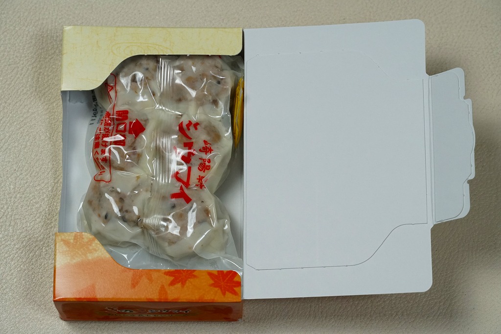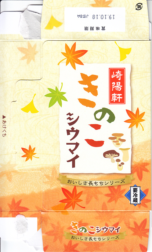 2019(令和元)年9月1日から11月30日までの販売の、秋の特製シウマイ。今回も引き続き、常温タイプと「おいしさ長もちシリーズ」の販売で、こちらは後者の冷蔵タイプ。紙箱も中身も味も、上記の差異と、この冷蔵版、「おいしさ長もち」版の紙箱の構造を除き、7年連続で据え置かれた。