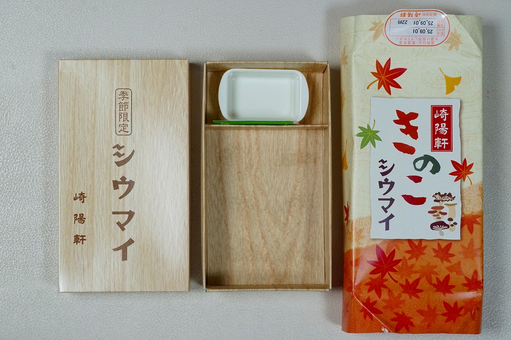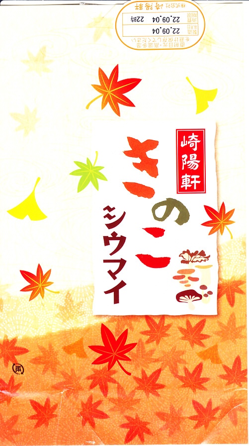 2003(平成15)年に発売された、季節の特製シウマイの秋版。今回も「きのこシウマイ」の、この常温タイプと「おいしさ長もちシリーズ」の両方を、2022(令和4)年9月1日から11月30日まで併売。折箱も包装紙も中身も風味も前年と同じで、実質的に10年連続で据え置かれた。