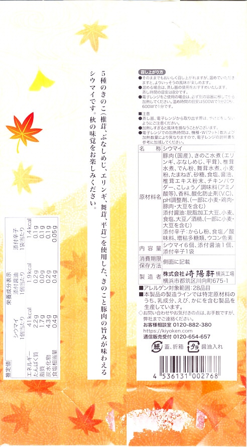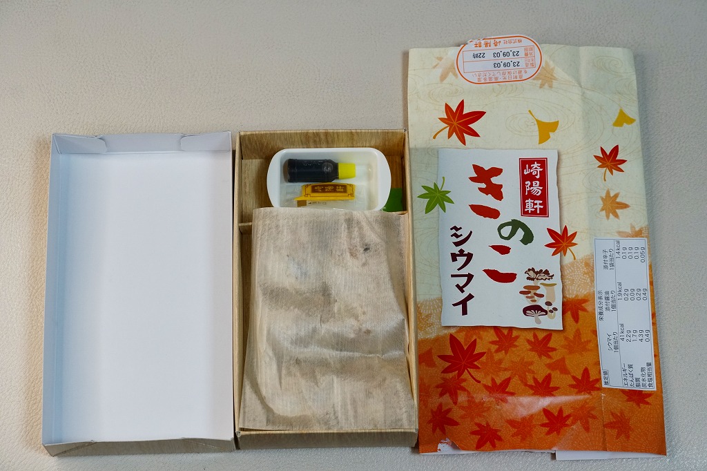 2003(平成15)年に発売された、季節の特製シウマイの秋版。今回も「きのこシウマイ」の、この常温タイプと「おいしさ長もちシリーズ」の両方を、2023(令和5)年9月1日から11月30日まで併売。折箱も包装紙も中身も風味も前年と同じで、実質的に11年連続で据え置かれた。しいたけ、ぶなしめじ、エリンギ、舞茸、ヒラタケと豚肉を混ぜ合わせた、中華の点心としては通常サイズ、崎陽軒の横浜駅弁としては大きいサイズのシウマイを、木目柄の紙箱に6個収め、醤油と辛子を添える。味も11年連続で据え置きか。価格は30円上がった。