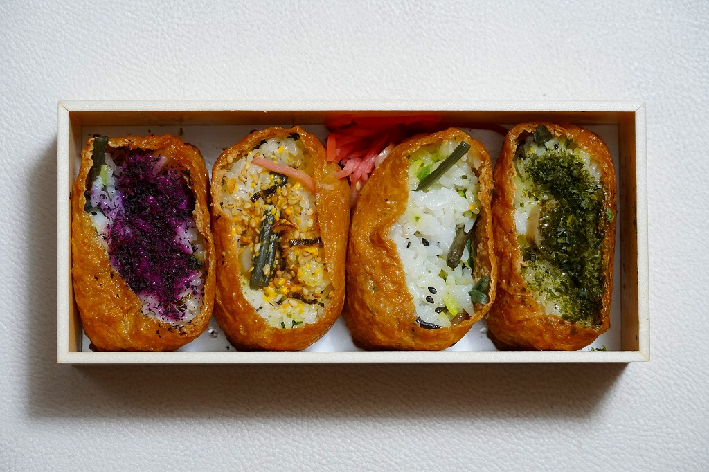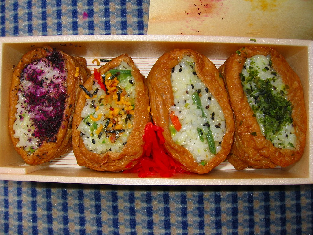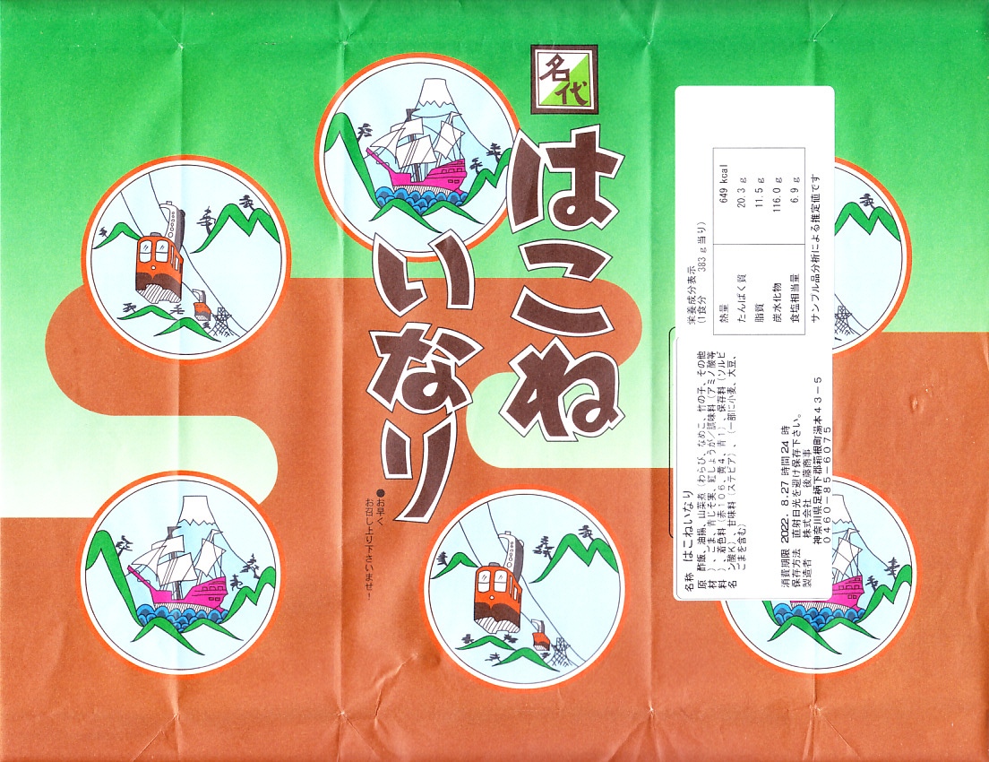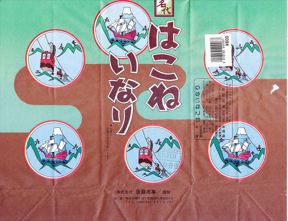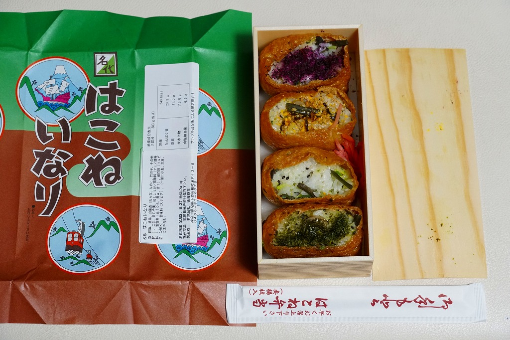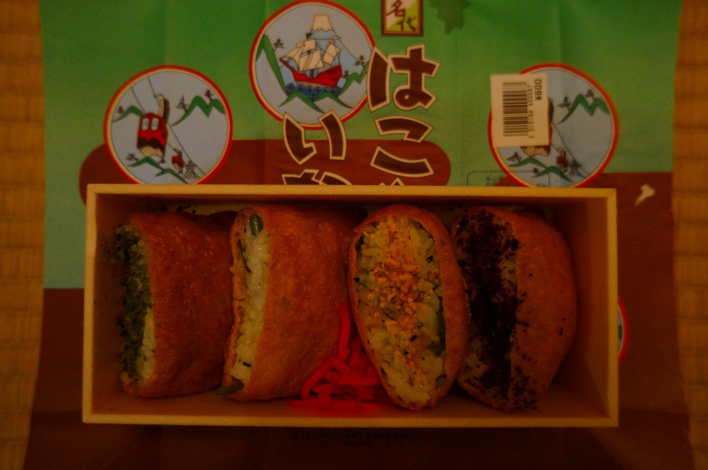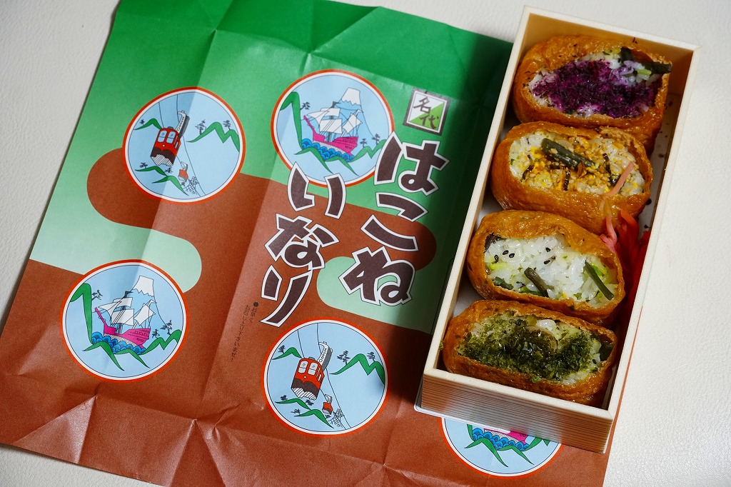 箱根湯本駅の稲荷寿司駅弁。長方形の折箱に、具を見せたおいなりさん4個と紅生姜を詰め、経木のふたをして、昭和時代の箱根ロープウェイと箱根海賊船を描いた包装紙で包む。具はそれぞれ、梅じそふりかけ、のり玉ふりかけ、山菜、青のりと、とてもシンプル。今の箱根や駅弁にない素朴さがあると思う。