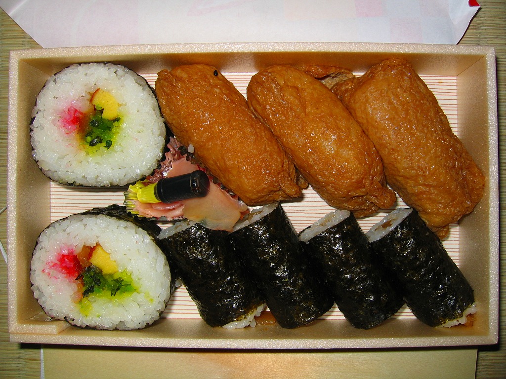 箱根湯本駅の助六寿司駅弁。長方形の容器に経木のふたをかけて掛紙で割りばしごと包み紙ひもでしばる。中身はおいなりさん3個、細巻4個、太巻2個の典型的な助六寿司。柔らかい味が特徴だが、具だくさんでもないのにこの分量でこの価格は割高感がある。