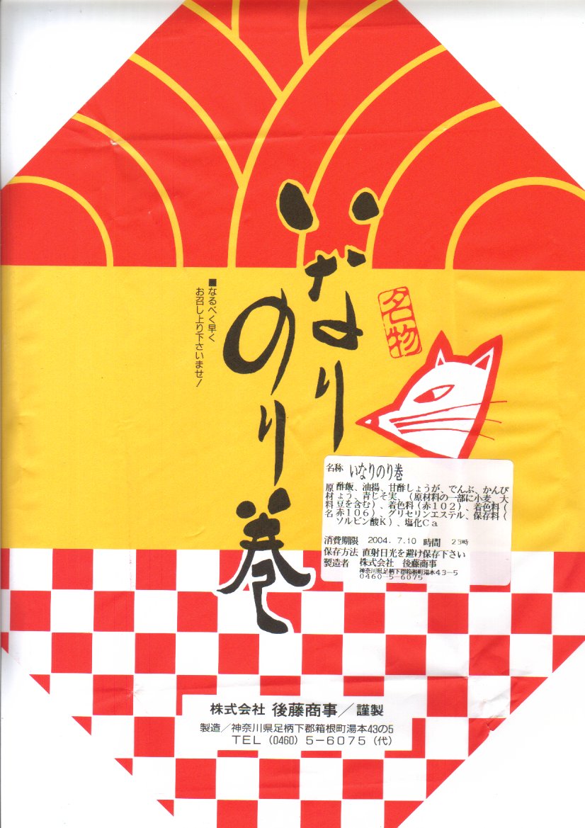 2004(平成16)年7月10日に購入した、箱根湯本駅の包装紙。2011年時点のものとデザインは同じで、当時は食品表示が食品表示ラベルになっていた。