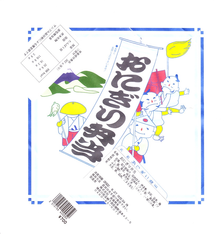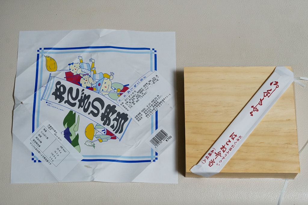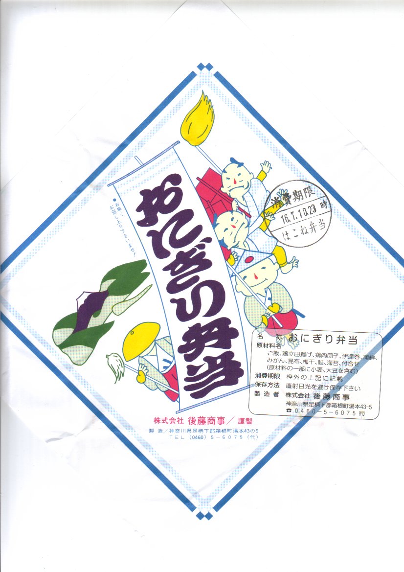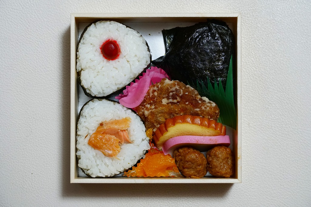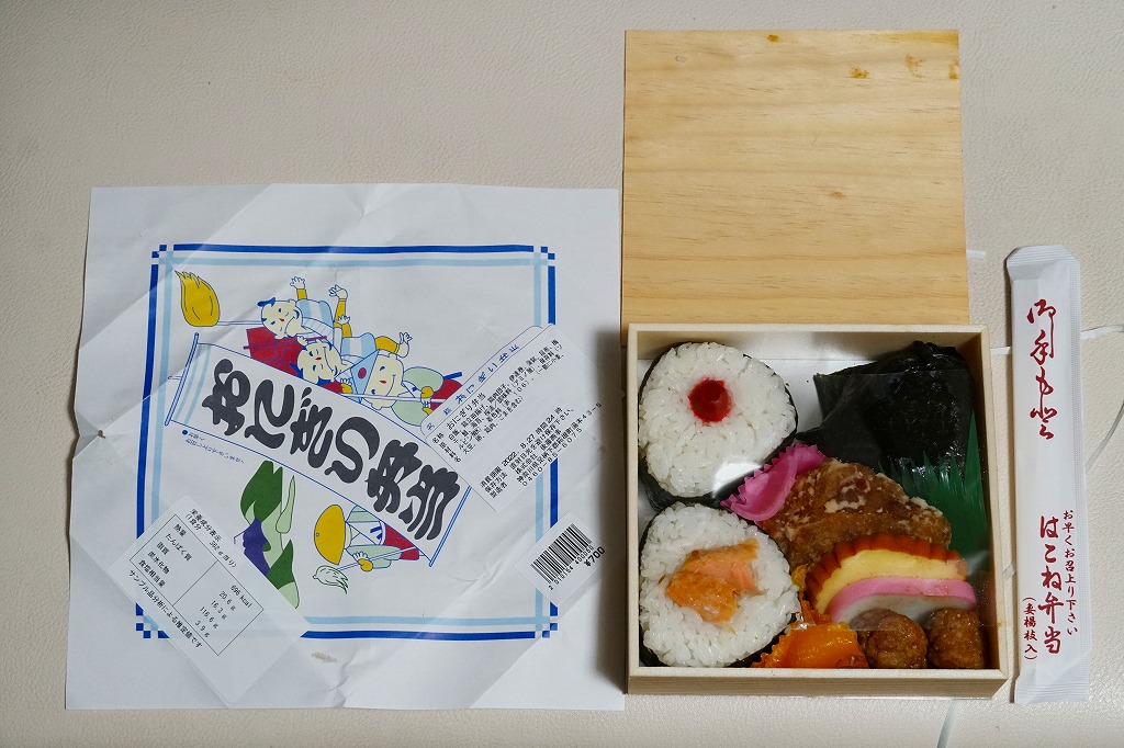 箱根湯本駅のおにぎり駅弁。平たい正方形の折箱に、平たい白飯に鮭と梅干しの具を貼り付けて周囲に海苔を巻いて三角形っぽく整形した、おにぎりというよりは海苔巻のような独特の形をした飯と、海苔で目張りした普通の形のおにぎりと、鶏肉の竜田揚、かまぼこ、伊達巻き、鶏肉団子、大根桜漬、みかんを詰める。内容はともかく、コンビニやスーパーにない見た目を持つお弁当。