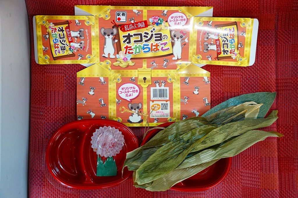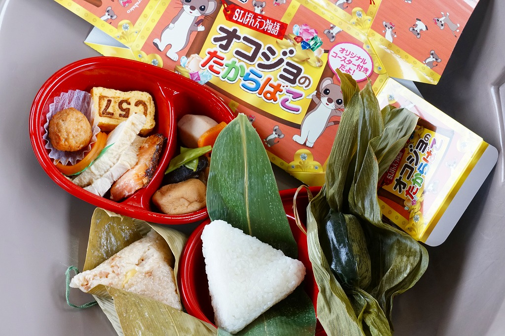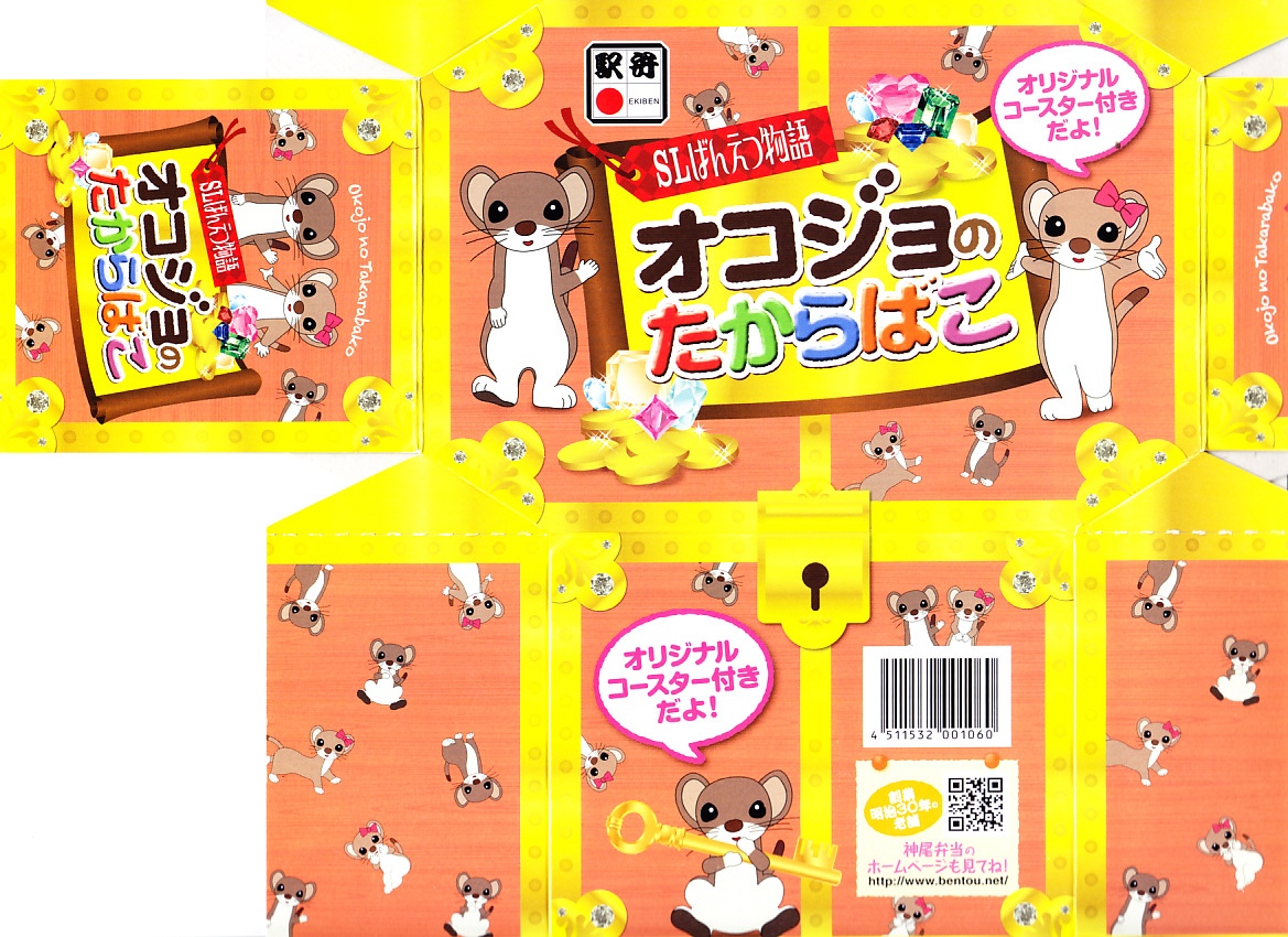 2012(平成24)年の7月に、磐越西線の観光列車「SLばんえつ物語」の車内売店で発売。JR東日本新潟支社が同年3月に、SL列車の公式キャラクターとしてオコジョの「オコジロウ」を設定し、4月に子供向けのフリースペース「オコジョルーム」を5号車に設けたため、これに合わせたものだろう。2015年に弁当の内容を子供向けから一般向けにリニューアル。