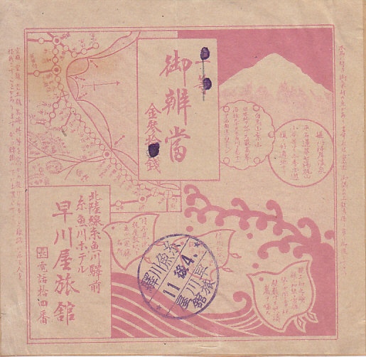 1930年代の調製と思われる、昔の糸魚川駅弁の掛紙。上等御辨當の「上等」を消し、価格を35銭から30銭に訂正した、昭和恐慌の頃のものだろう。劣化なのかどうか、色彩も紙質も第二次大戦末期の頃の駅弁掛紙くらい悪い。絵柄は海と山と鳥と鉄道路線図。