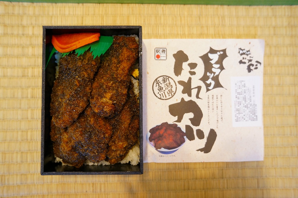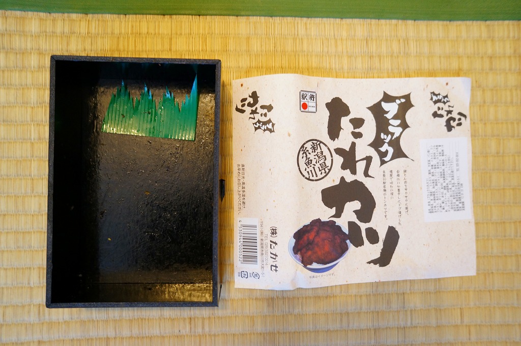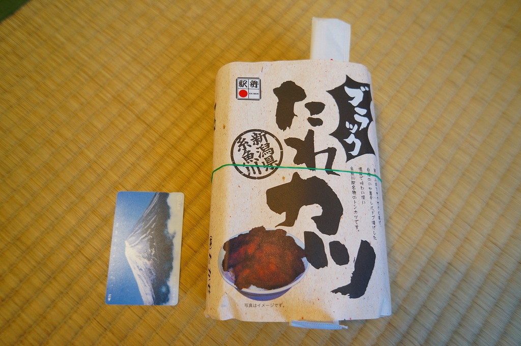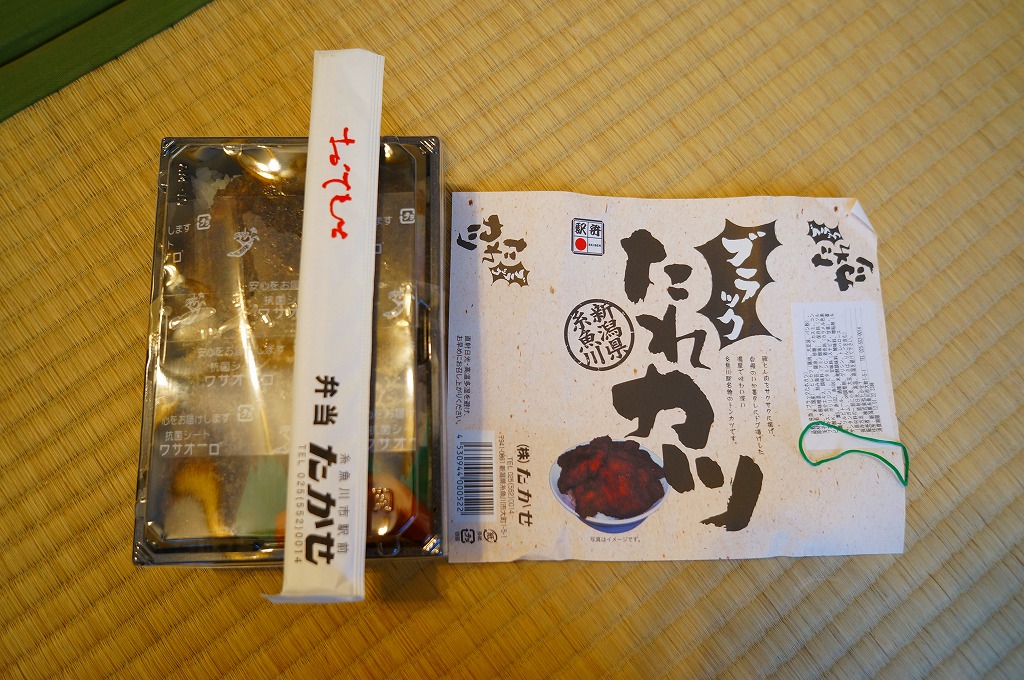 「駅弁図鑑 西日本版」によると2012(平成24)年2月23日の発売。ということは、京王百貨店の駅弁大会での輸送販売は先行販売か。いずれにせよ、糸魚川駅では今世紀あるいは平成に入って初めての新作駅弁ではないかと思う。真っ黒な長方形の容器に透明なふたをして、商品名の黒書きや中身のイメージ写真などを印刷した掛紙を巻く。