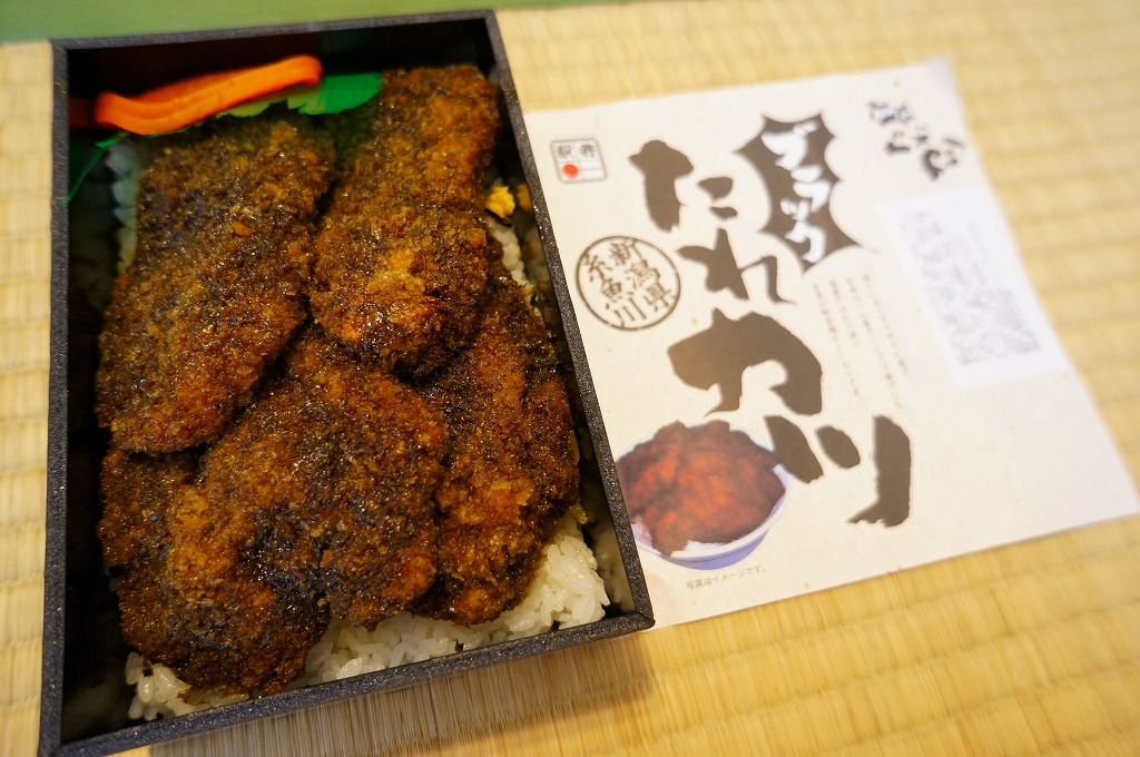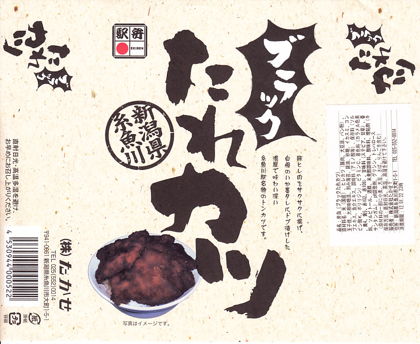 中身は白御飯の上に玉子焼をちりばめて、イカスミ入りのタレに漬けたという確かにどす黒いトンカツ4切れを折り重ね、ダイコン味噌漬を添えるもの。コンセプトとカツの味は癖があるなりにユニークで面白く気に入ったが、購入した品物は寒い中の輸送にしても御飯がひどくボロボロで不味く、これはもったいない限り。現地では3日前までの予約販売だと案内されている。調製元の閉店により2013年11月限りで終売となった。