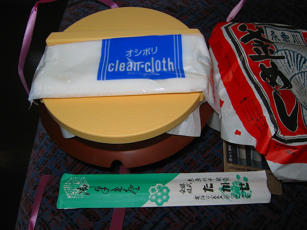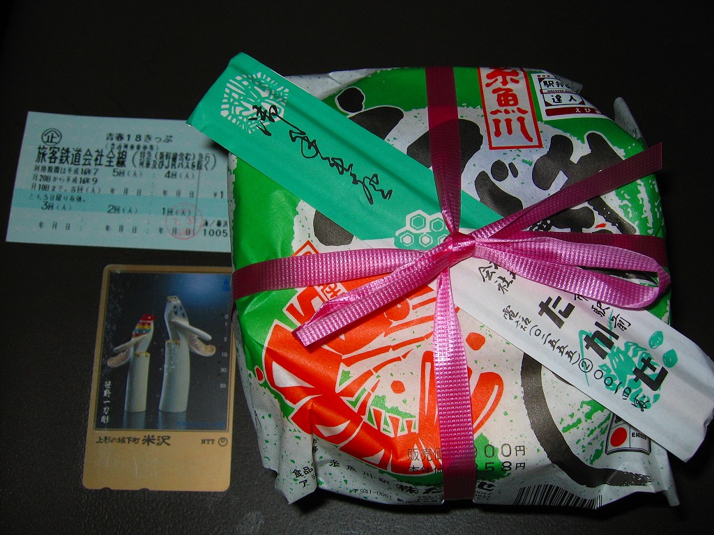 下記の駅弁「越後糸魚川笹すし」を、ちょっとリニューアル。名前を少し変えて、掛紙を巻いて、中身は鮭そぼろ・きゃらぶき・クルミ・紅しょうが・青しそ身・桜でんぶ・玉子の3本の笹寿司のうち1本の具を、シイタケ旨煮・ふきみそ・ミョウガ酢漬け・きゃらぶき・クルミに差し替えている。具をこれだけ変えても、味があまり変わらないのは不思議。
