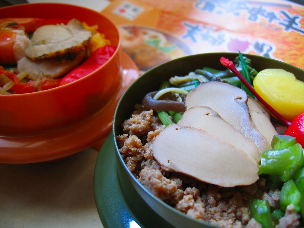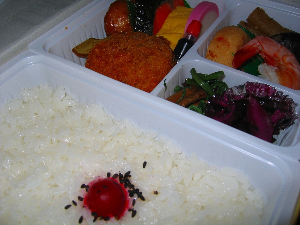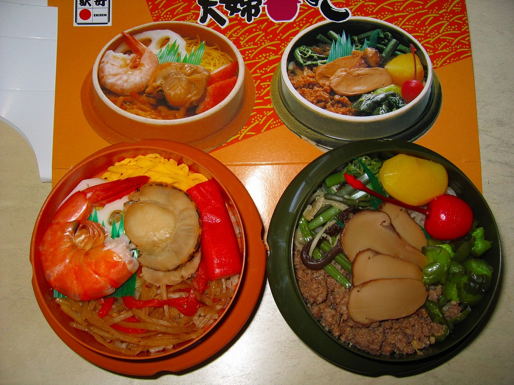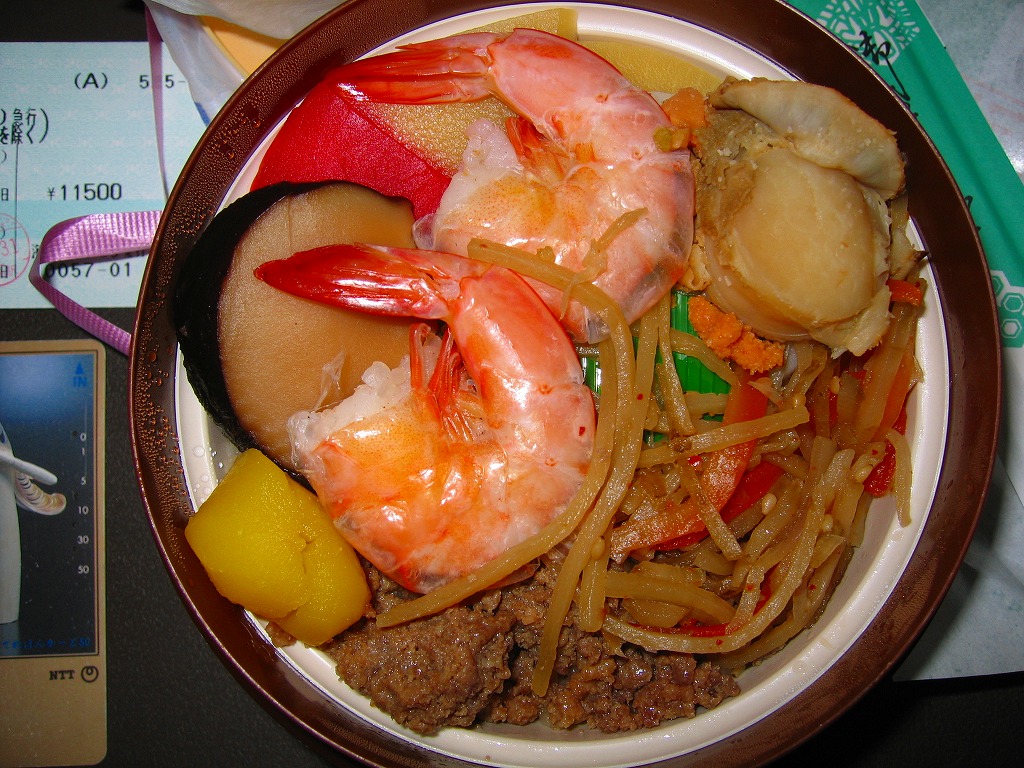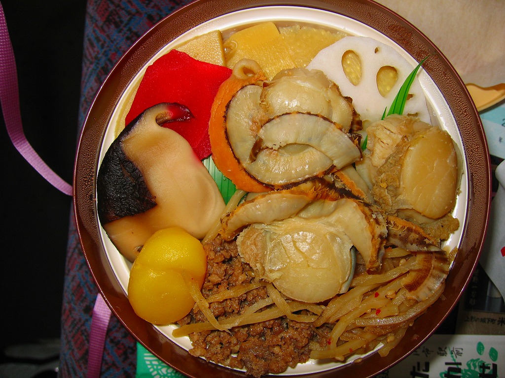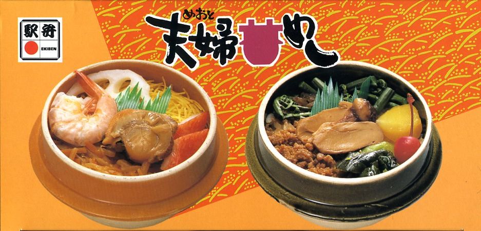 2個に分かれているけれど、分量はひとりぶん。夫婦で仲良く分けて食べられるという紹介文がつきまとうが、実際はどうも、松茸が男性で貝が女性という意味も込められているそうな。駅弁ではあまり聞かれない、オトナの味。調製元の閉店により2013年11月限りで終売となった。