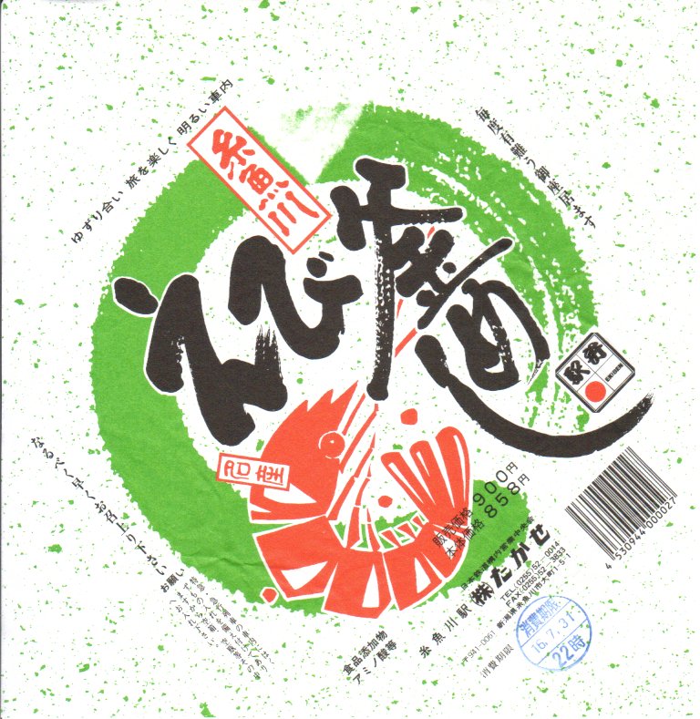 1987(昭和62)年か翌年の、9月18日16日の調製と思われる、昔の糸魚川駅弁の掛紙。日本鉄道構内営業中央会とあるので1987(昭和62)年4月の国鉄分割民営化の後で、1989(平成元)年4月の消費税の導入により価格が720円なる前のものか。上記の駅弁「えび釜めし」と、中身は変わらなかった模様。掛紙の絵柄は異なり、しかしその雰囲気はあまり変わらず、おそらく当時は焼き物の釜に木のふたをしたと思われる。