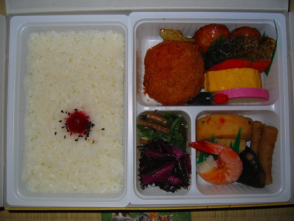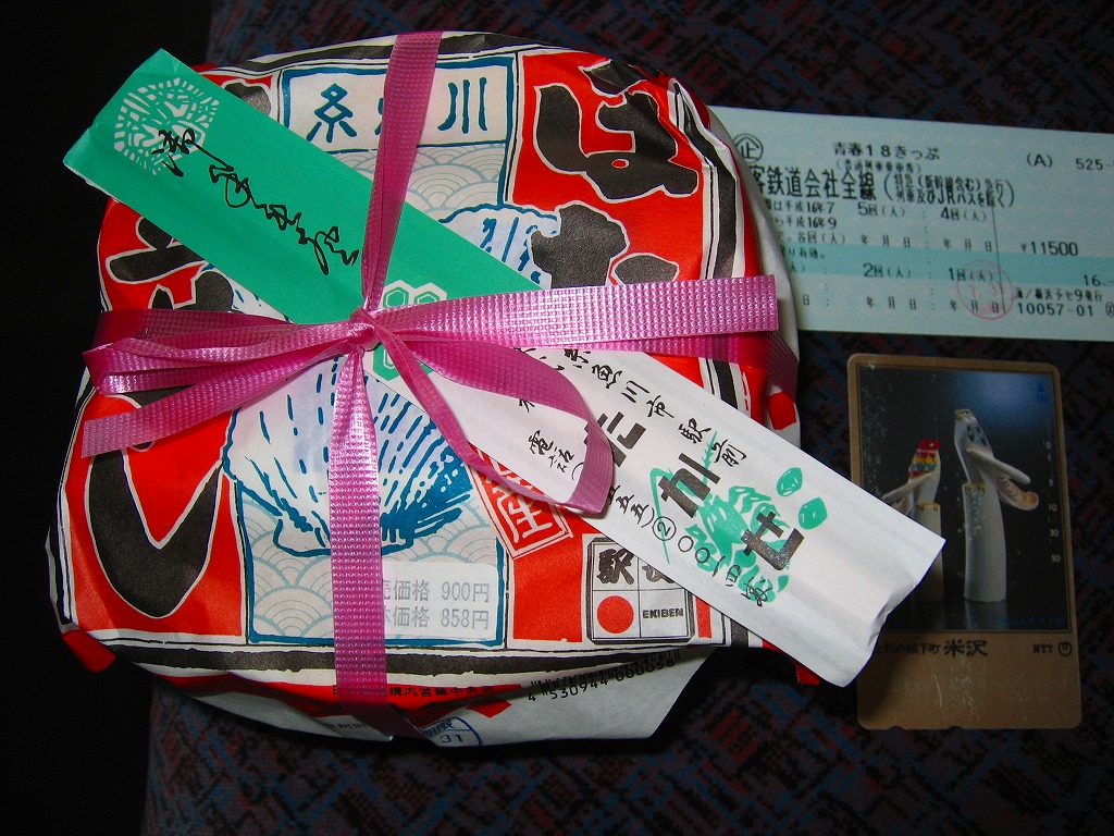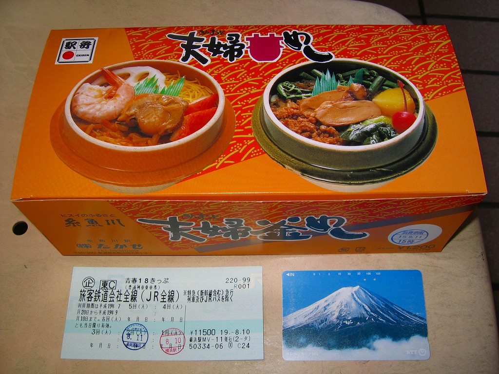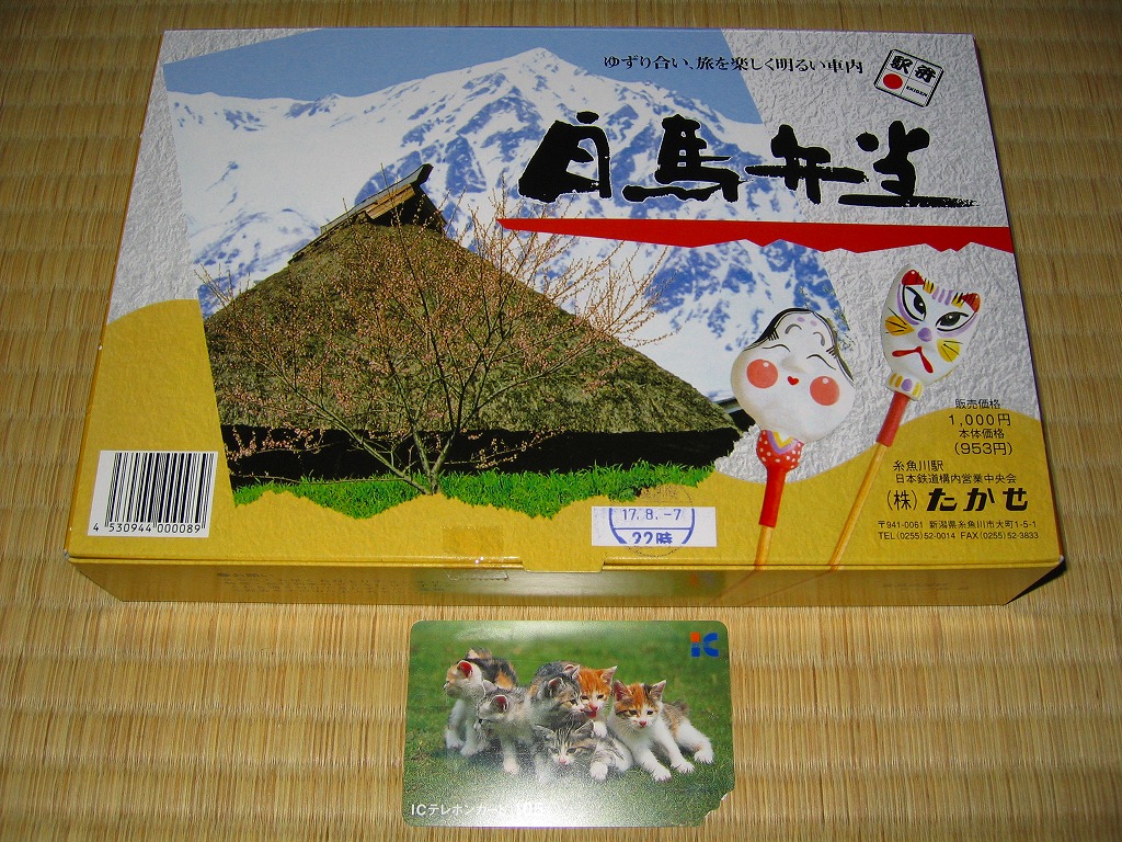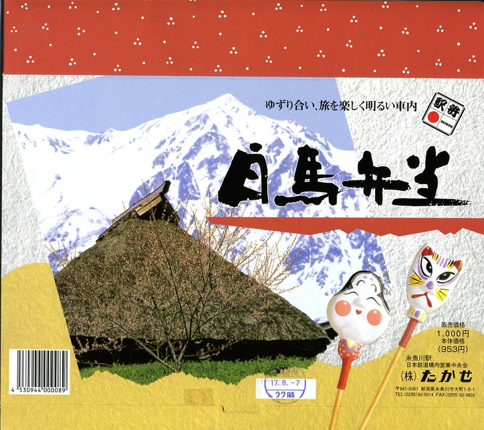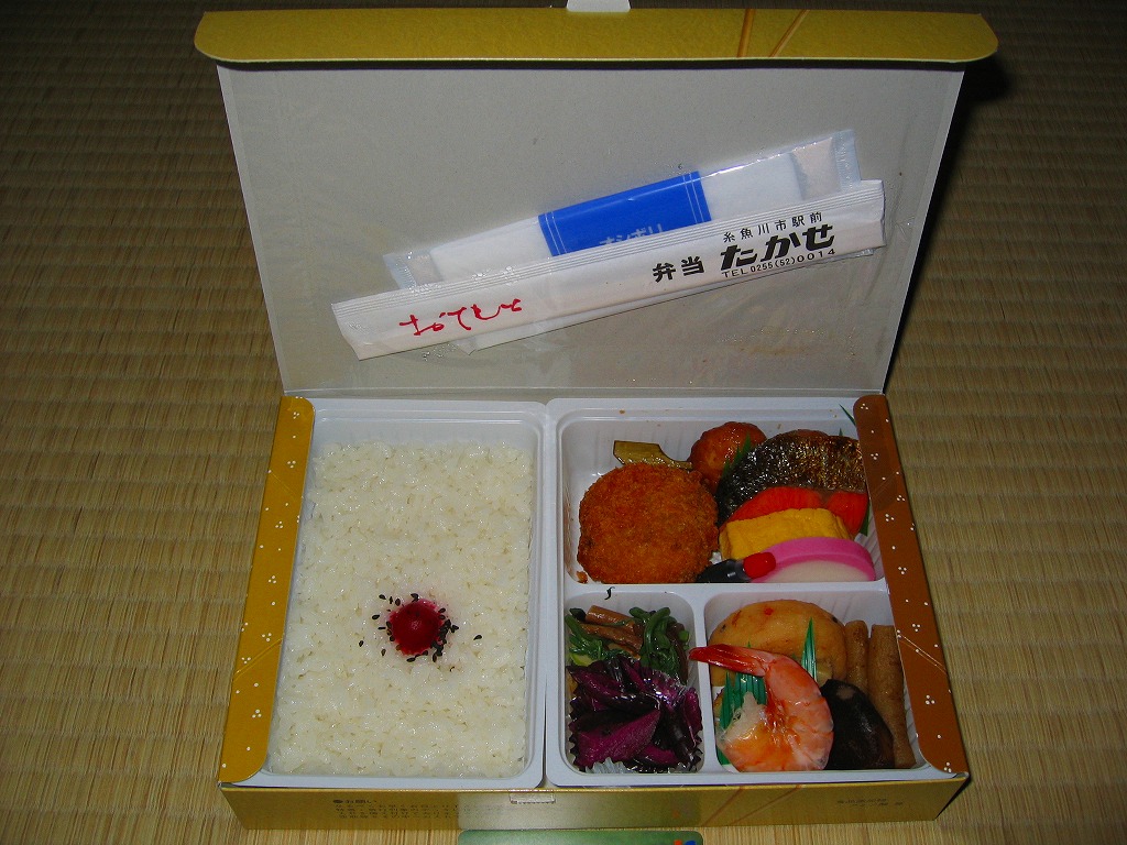 糸魚川駅で唯一の幕の内駅弁。専用のボール紙箱には、茅葺き屋根と白馬連峰を描いた。白いプラ製トレーに入った中身は、ひとつが日の丸御飯、もうひとつがおかずで焼鮭、蒲鉾、玉子焼、つくね、帆立フライ、山菜、煮物各種など。価格と内容を見比べて、少し残念な意味で古めかしい、幕の内タイプの駅弁に感じた。北陸本線の特急列車の車内販売では、このような普通の幕の内弁当が他にあまりなかったようで、そこでは親しまれたものか。調製元の閉店により、2013年11月限りで終売となった。