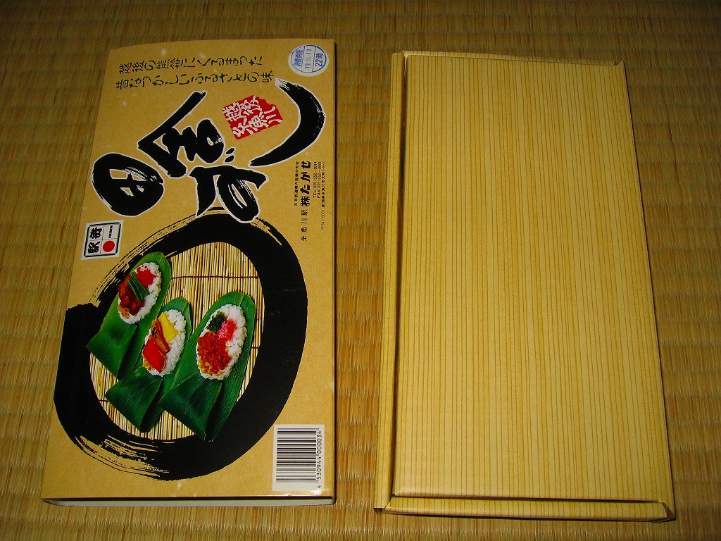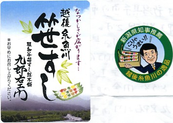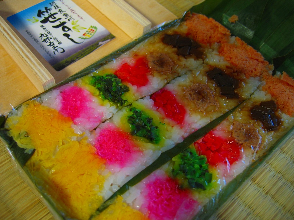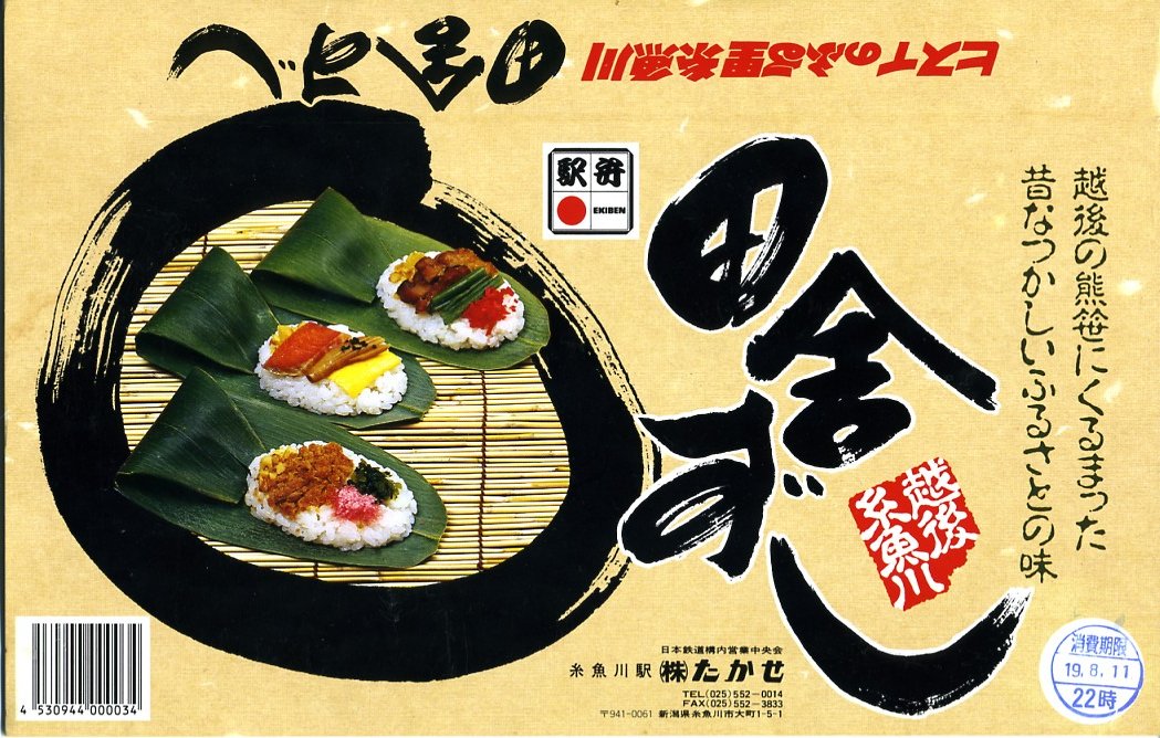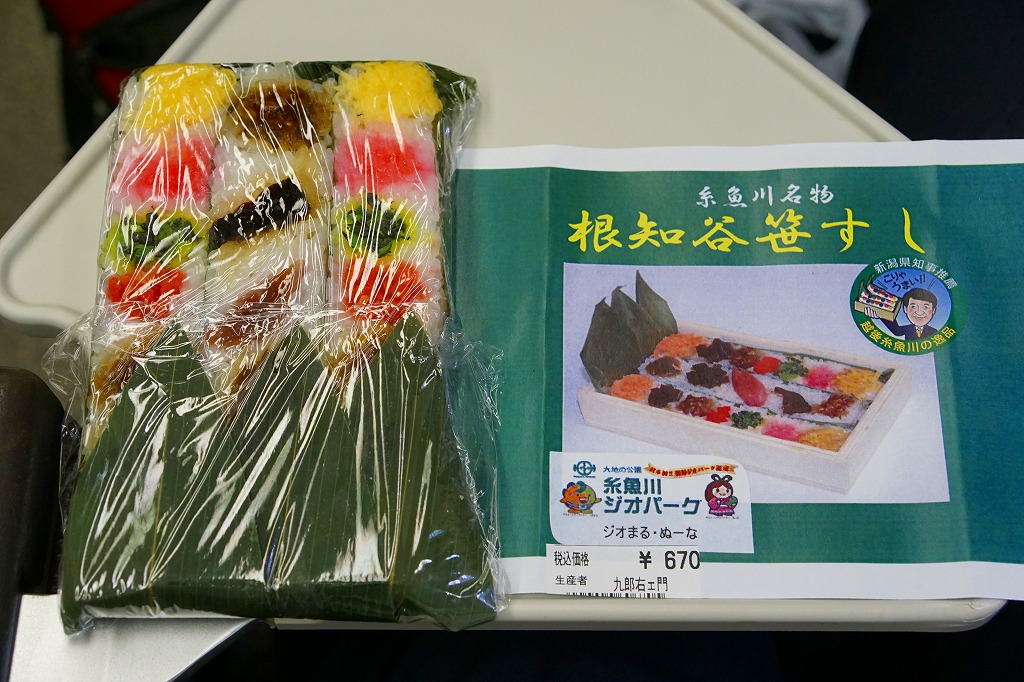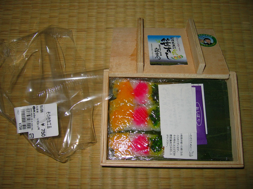 2009(平成21)年の購入時の数年前から、越後湯沢駅や糸魚川駅の売店で販売されていた、糸魚川の郷土料理。とても小さな木製の押寿司容器をラップで包む。容器の中でさらにラップで包まれた中身は、笹の葉に酢飯を詰めて、卵、桜でんぶ、青シソの実の漬物、紅生姜、くるみ、キャラブキ、鮭そぼろをこの順番で貼り付けた、やはりとても小さな棒状笹寿司が3本入るもの。商品の解説と宣伝として、手書きのコピーがついていた。