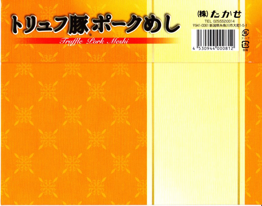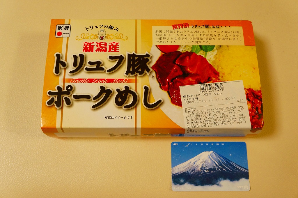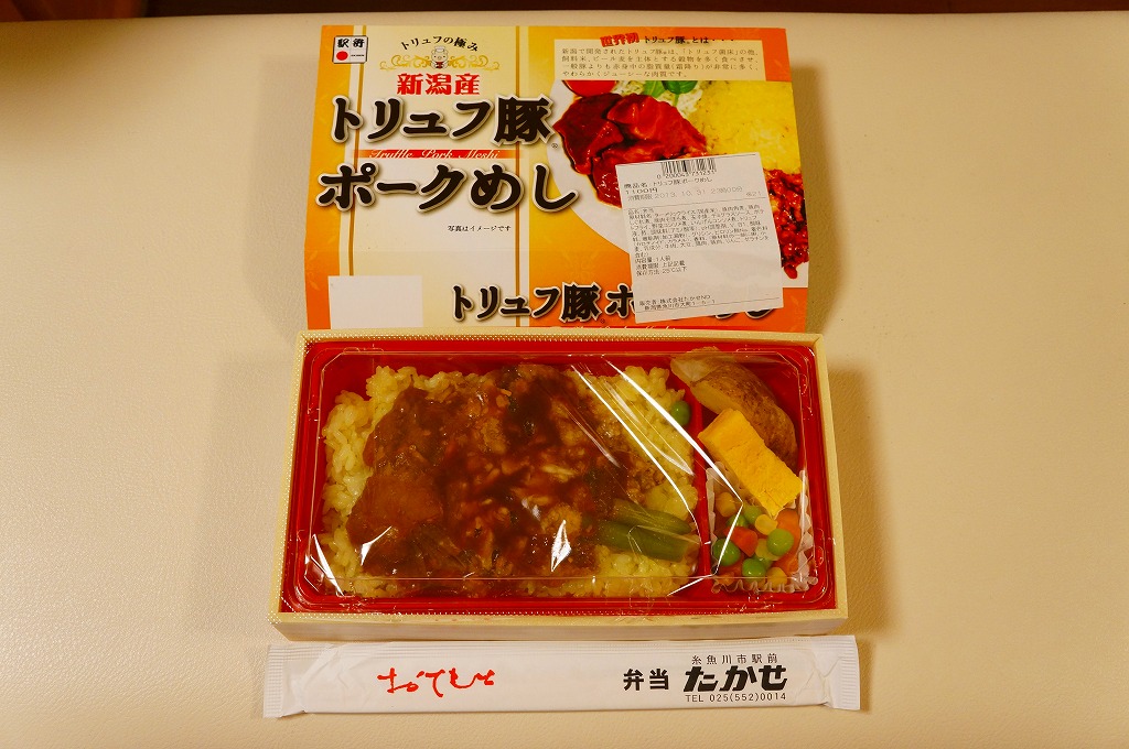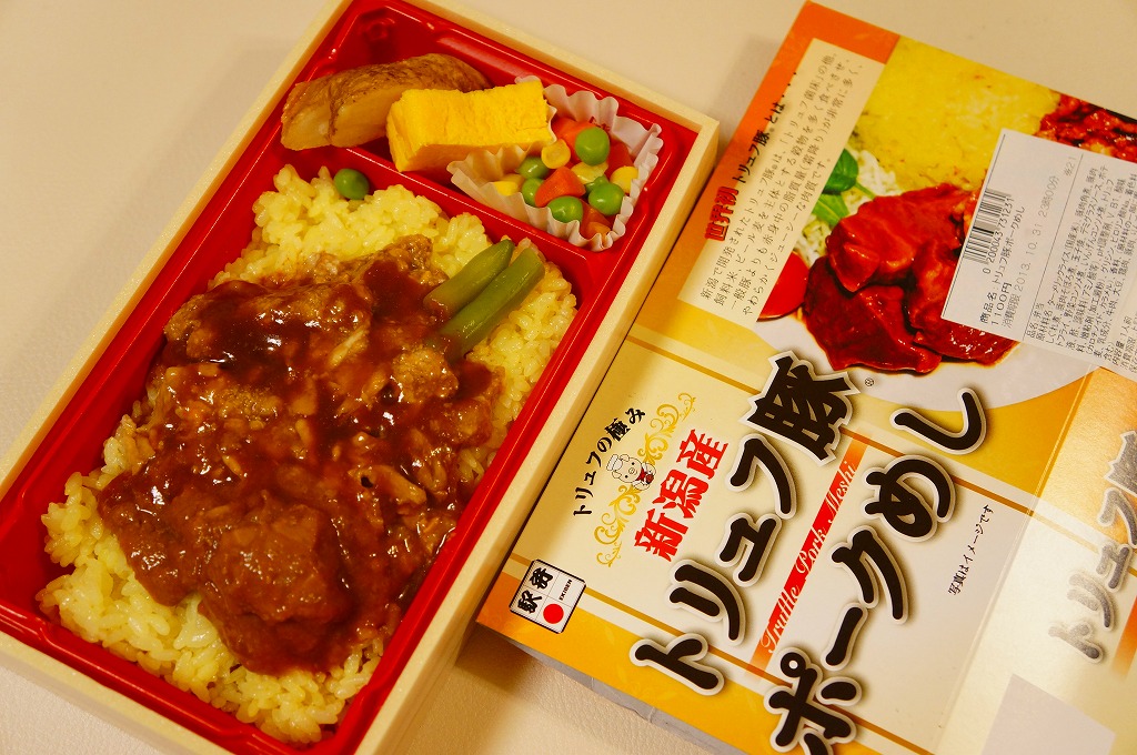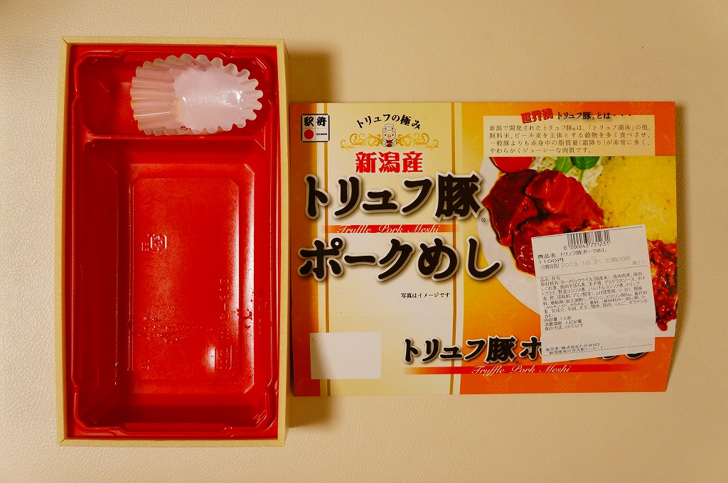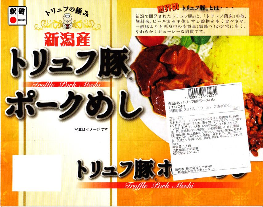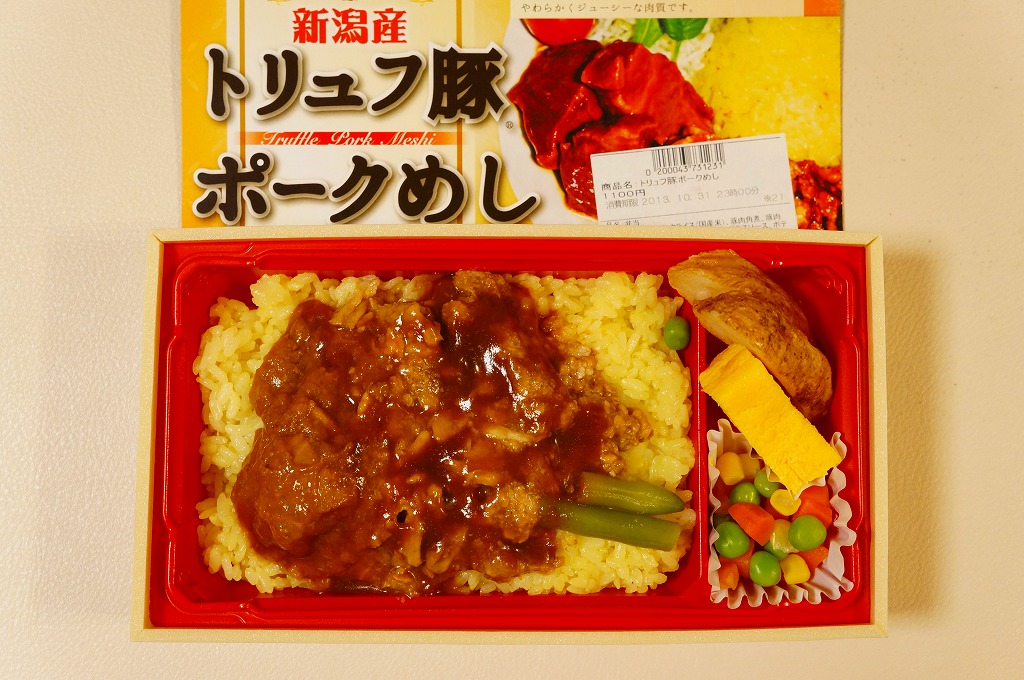2013(平成25)年9月20日の発売。長方形の容器にターメリックライスを詰め、豚肉の角煮としぐれ煮とそぼろ煮を混ぜたあんかけをかけて、フライドポテト、玉子焼、ミックスベジタブルを添える。高級キノコのトリュフが入っているのではなく、トリュフ入りの飼料で育てた新潟県の企業のブランド豚「トリュフ豚」を使ったお弁当。にゅるにゅるとして変わった豚丼駅弁だなと思ったら、調製元の閉店により2013年11月限りで終売となり、わずか72日間の販売で姿を消してしまった。