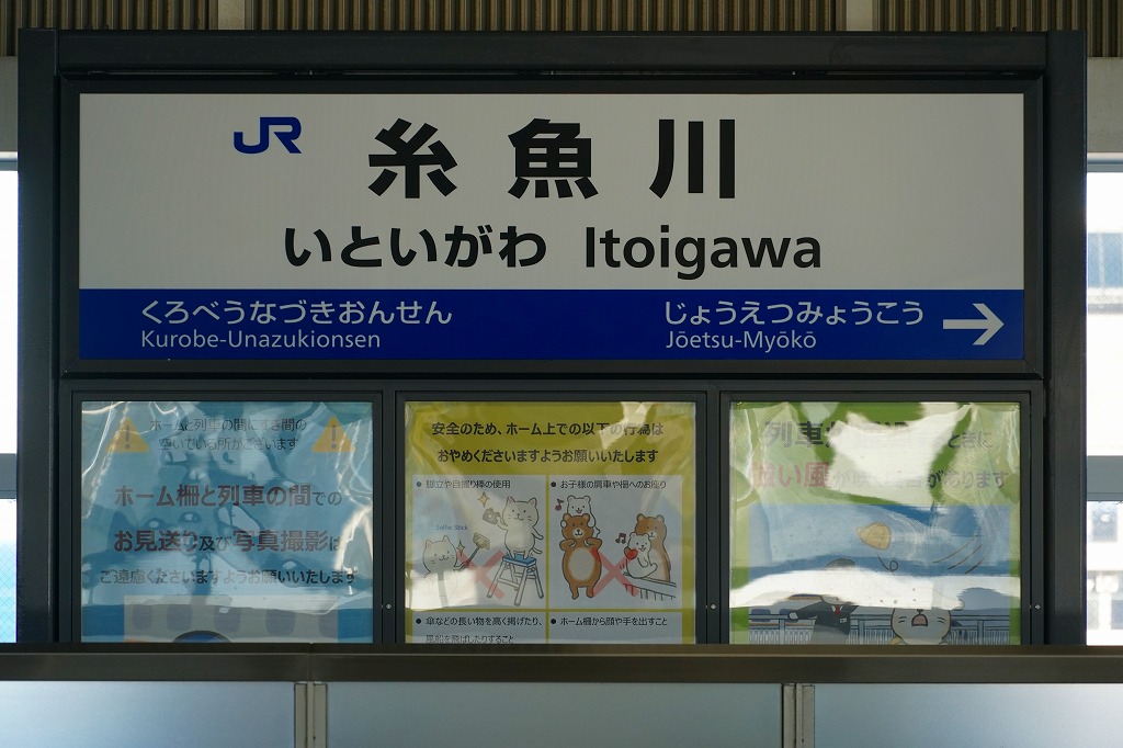 東京駅から新幹線で2時間強。糸魚川市は新潟県の西端で日本海に面する、人口約4万人の宿場町。江戸時代に北国街道と千国街道が交わり、これが鉄道や道路に替わった交通結節点であるほか、近代に水力発電や石灰や白土の産業が興り、第二次大戦後はヒスイの産地やフォッサマグナの観光でアピール。駅弁は国鉄時代からの駅弁屋が駅開業の頃から名を変えながら長らく営業したが2013年11月限りで閉店、キヨスクで売られた地元の弁当も2015年3月の新幹線の開通までに消え、2022年秋頃から土日曜の観光案内所で売り始めた「キハめし」も2025年春頃に消えた。1912(大正元)年12月16日開業、新潟県糸魚川市大町1丁目。