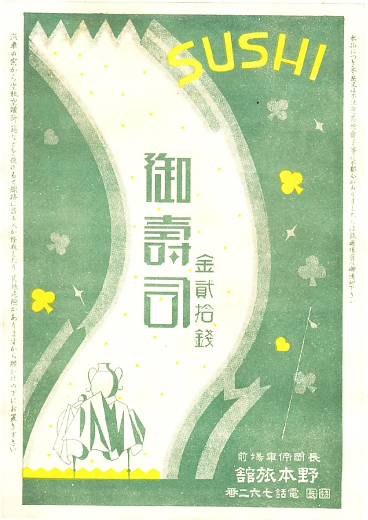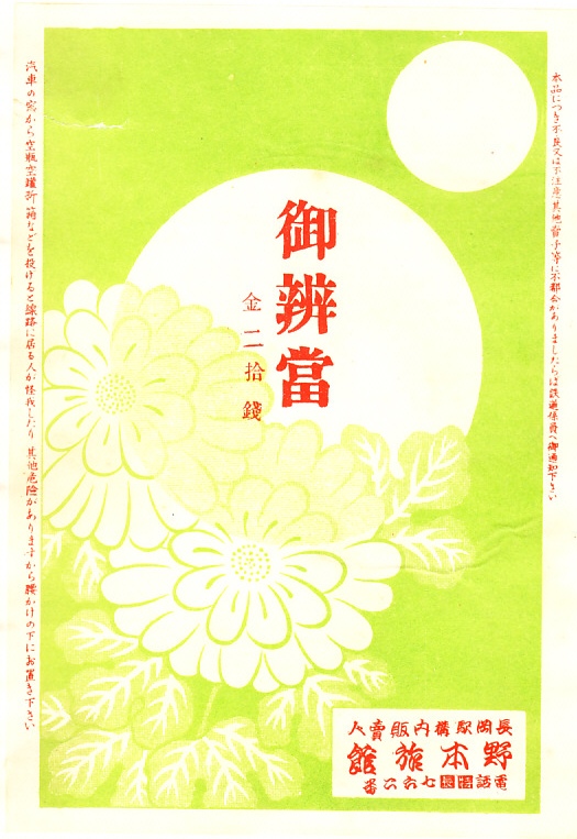 1900年代、明治30年代のものと思われる、昔の長岡駅弁の掛紙。弁当15銭、折詰すし10銭、包すし6銭の定価からそう判断した。これは駅弁の掛紙ではなく、調製元の広告チラシかもしれない。後の野本弁当部は、1904(明治37)年頃から長岡駅で駅弁などを販売したという。