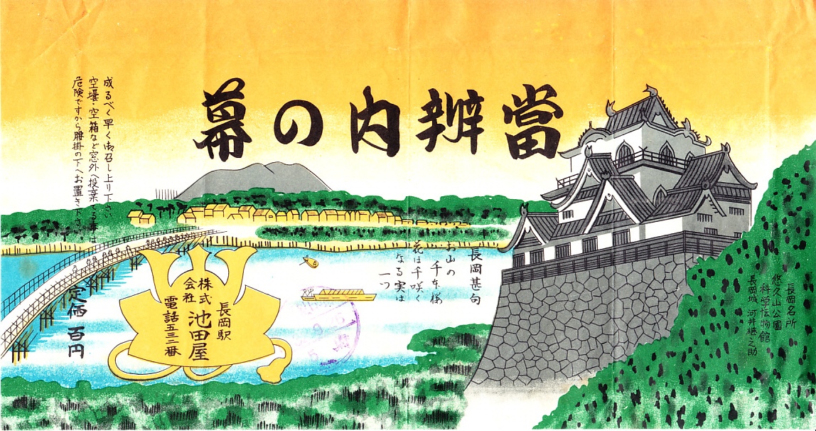1957(昭和32)年5月28日20時の調製と思われる、昔の長岡駅弁の掛紙。長岡は城下町として生まれたが、後に長岡駅の敷地と化した長岡城は水堀に囲まれた平城であり、掛紙に描かれたり後に悠久山へ郷土資料館として外観を再現した山城ではない。となると、この掛紙はどこの城を描いたものか。江戸時代の信濃川になかった木橋も描くイメージイラストか。