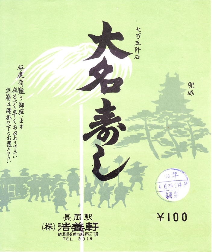 1963(昭和38)年4月26日(金)13時の調製と思われる、昔の長岡駅弁の掛紙。兜城と松林と大名行列で長岡を表現か。この名の駅弁は手持ちの資料では、1964年の長岡駅にみられるのみ。中身は立派な太巻きか何かだったのか。