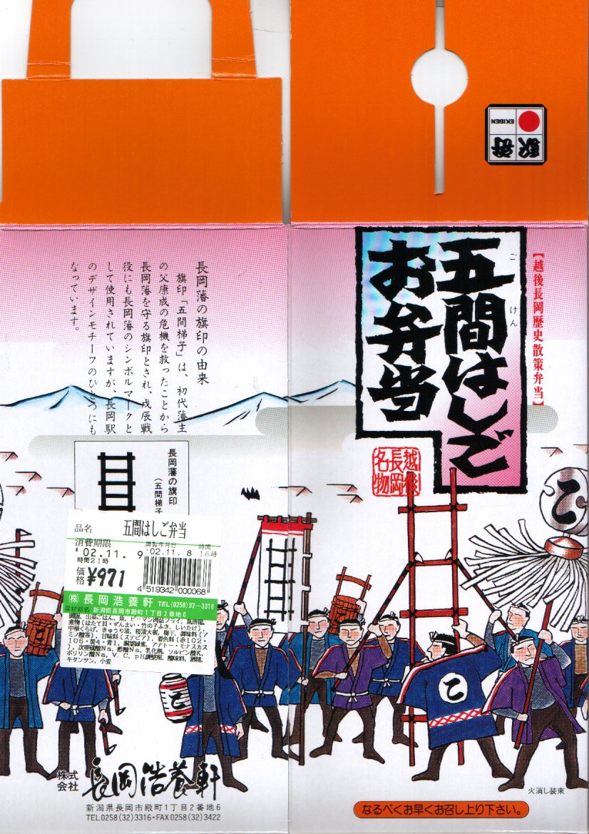 長岡藩の旗印「五間梯子(はしご)」にちなみ、パッケージにもそれが描かれる。味は良いが狭い列車内では食べ辛そうで、駅弁大会か持ち帰りまたは多人数でいただくのが適当か。食事のための弁当ではなく酒のつまみになるものがたくさん入っていると面白そうな気がした。しかしこの駅弁は、2009年6月の調製元の事業停止により失われた。