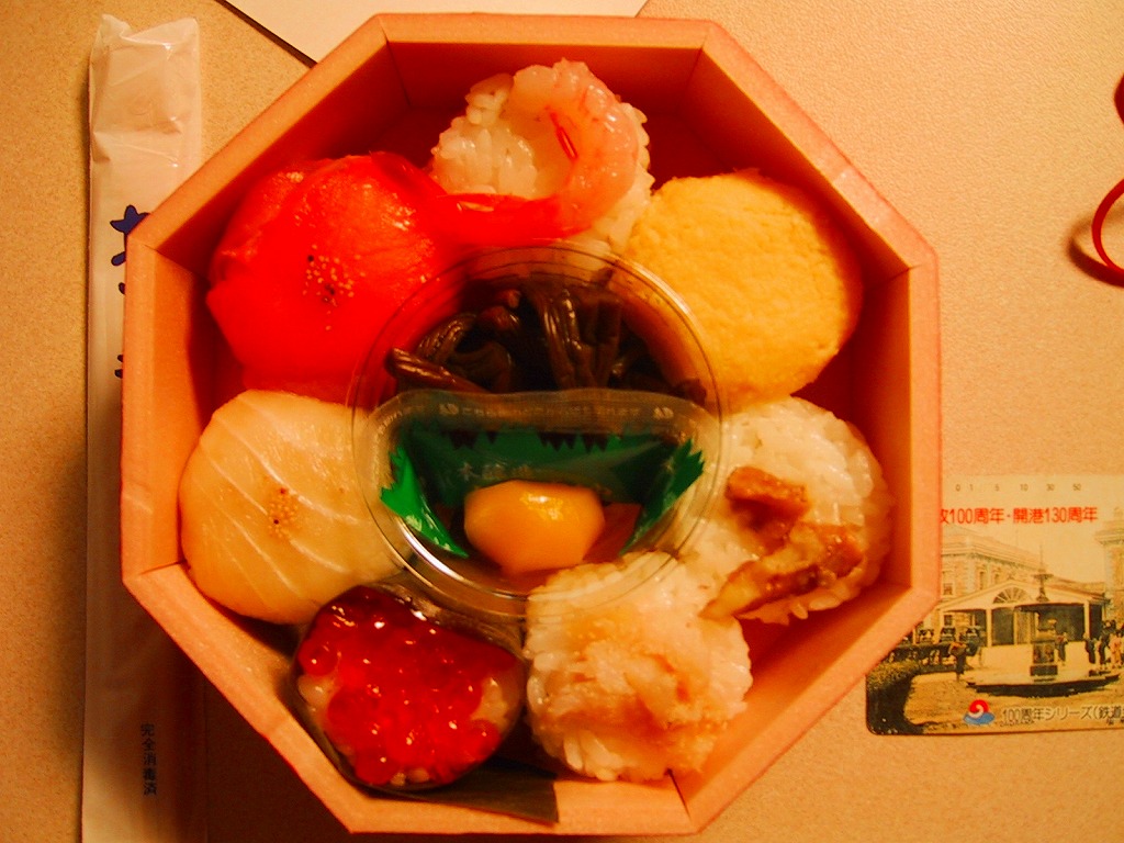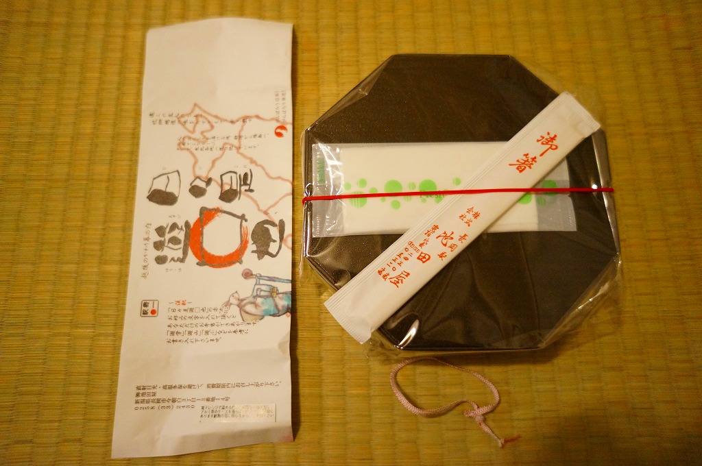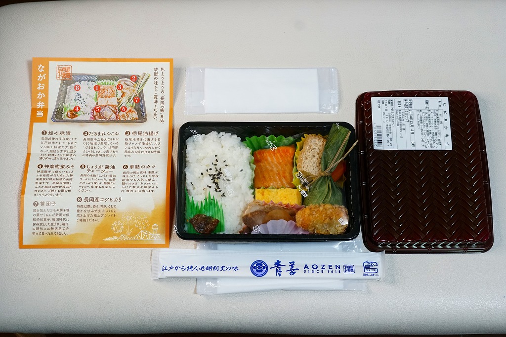 正八角形の容器に、A4判にたくさんの文字を書いた掛紙を巻く。中身はフィルムに包んだ円柱形の日の丸おにぎりと醤油飯おにぎり、神楽南蛮鶏団子3個、牛肉うま煮、玉子焼、ミョウガ味噌漬、イカにんじん、笹団子など。長岡ではなく福島がテーマのようにも掛紙で読めるが、幕の内とも書いてあるので、一風変わった普通弁当として新幹線での一食に良い感じ。