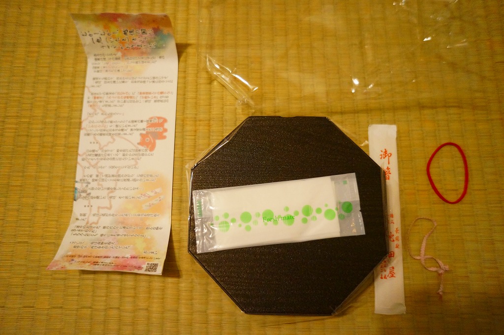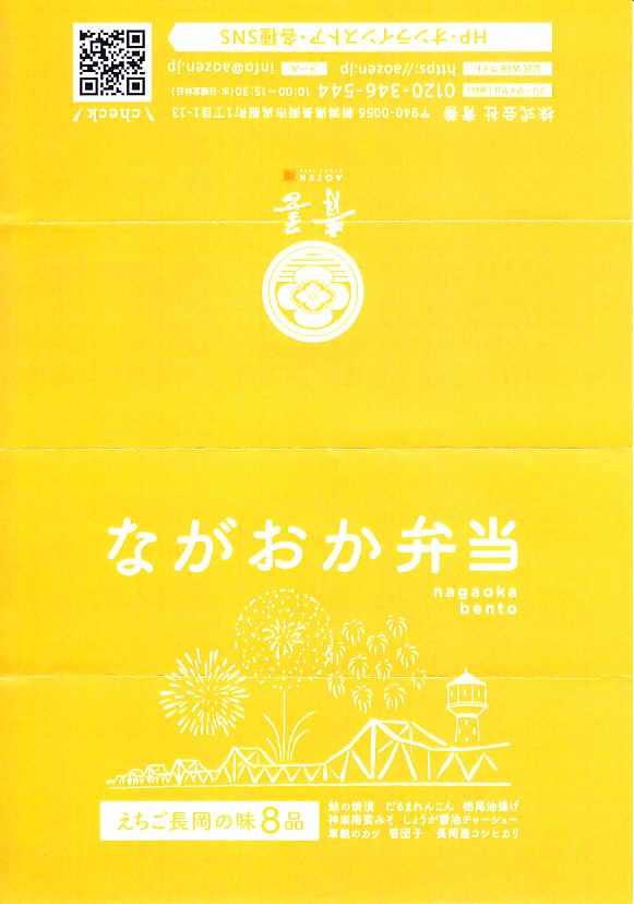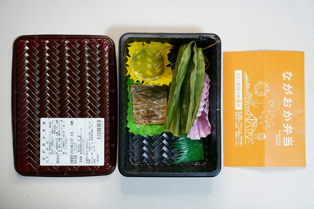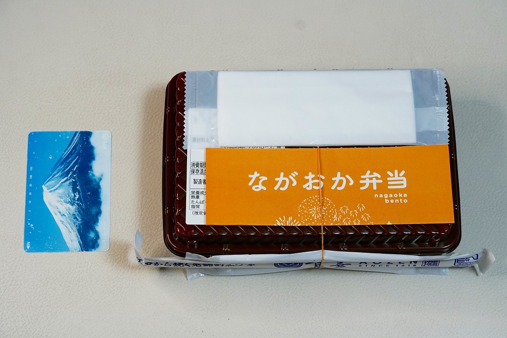 2022(令和4)年の10月14日の鉄道150年に向けて、長岡呉服町で元和4年(1618年)に創業したという仕出し料理店と、JR長岡駅のコンビニ「ニューデイズ」が協力し、改札外と新幹線改札内の同店舗で発売か。駅弁でも惣菜でも見たことがない、編み物のような型を持つ真っ黒なプラ容器に置いたしおりは、表面に商品名や長岡花火の風景などを記し、裏面にイラスト付きのおしながきを載せて、駅弁の掛紙のようなつくりをしていた。