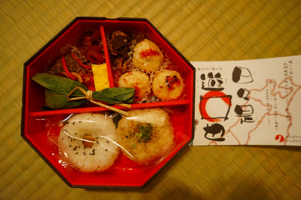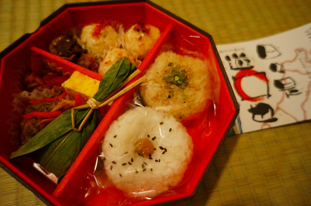 中身は梅肉とごま、菊酢漬けとごま、神楽南蛮としその実漬けで3種4個の球状御飯と、カボチャやレンコンの煮物、牛松風焼なる方形ハンバーグ、玉子焼、大学芋ことサツマイモのスティック、笹団子、漬物2種にとてもとても辛い神楽南蛮塩漬など。昭和と21世紀が混じったような風味と内容であり、本物2枚と紙製1艘と模造2枚で笹の葉たっぷりの内容でもある。