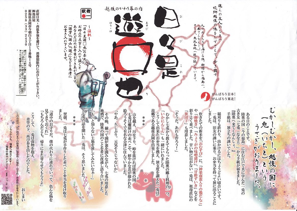 2011(平成23)年11月20日に、4県12社の駅弁業者を集めた新潟駅での駅弁大会「がんばろう東北!被災地応援駅弁合戦」で発売、翌年の春まで販売された期間限定駅弁。名前は「ひびこれあそび□なり」で、□の部分にお好みの文字を入れて欲しいそうな。