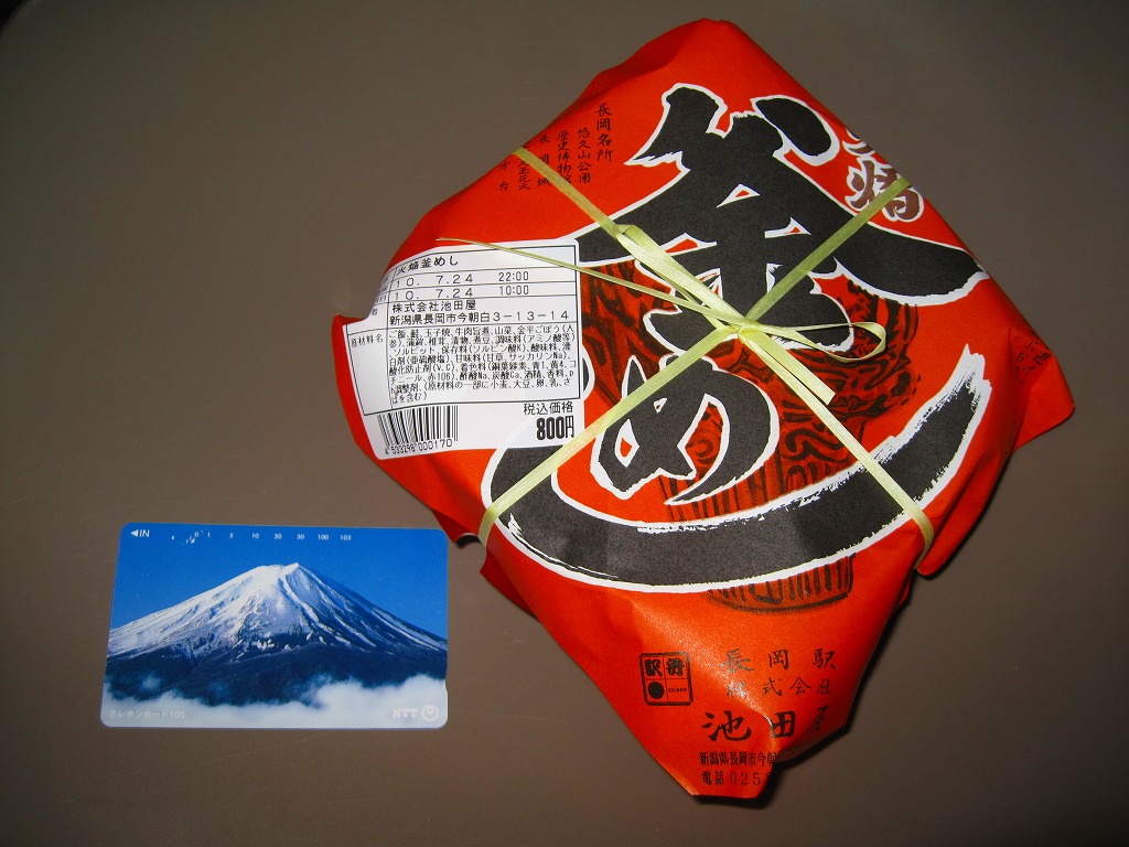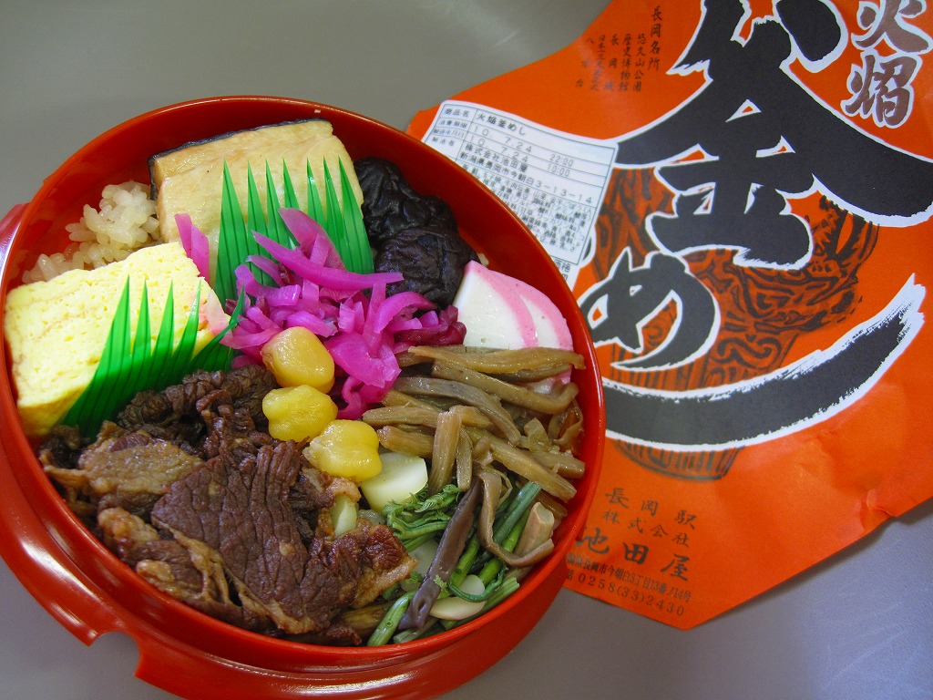 昭和60年代の発売か。浅く平たく浅いプラ製の釜型容器を使用、駅弁の名前と土器を描いた朱色の掛紙をかける。中身は茶飯の上を牛肉旨煮、焼鮭、玉子焼、山菜、きんぴらごぼう、かまぼこ、椎茸、煮豆、漬物で覆うもの。牛肉入りの釜飯が駅の顔となるのは、ここと山陰本線和田山駅くらいだろうか。筋が歯間に挟まるワイルドさは長岡駅弁の特徴だと思った。価格は2010年の購入時で800円、2015年時点で850円、2020年時点で950円、2023年時点で1,050円。調製元の公式サイトでは2023年時点で「お休み中」とのこと。