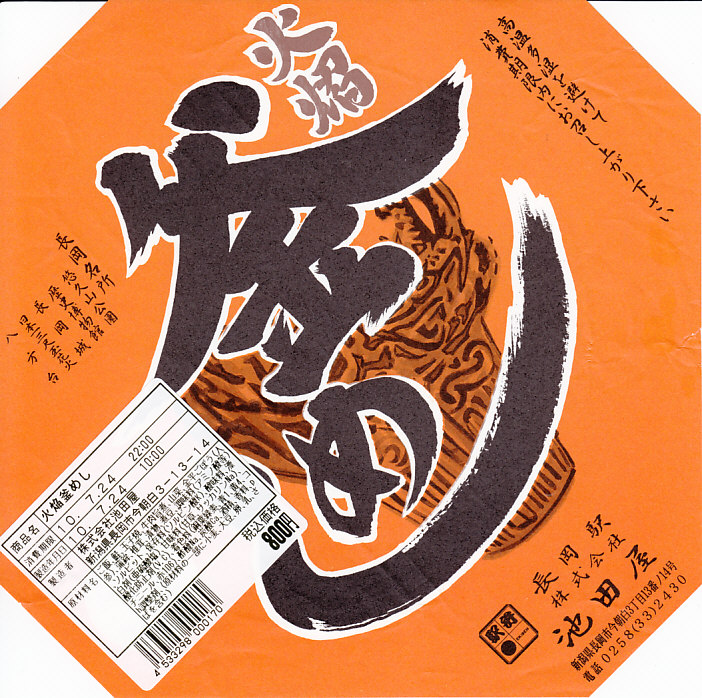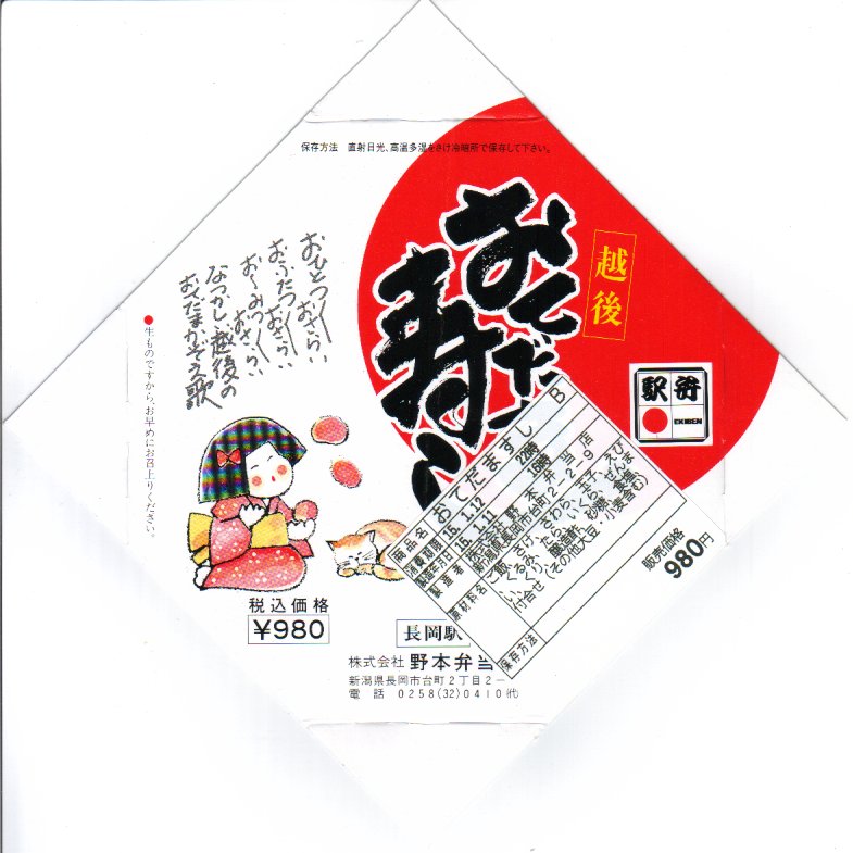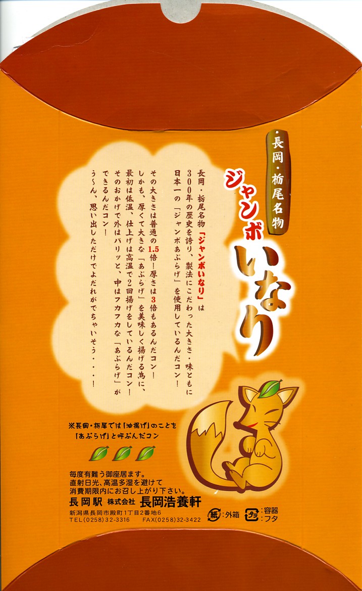 JR20周年の記念駅弁の、長岡駅弁の長岡浩養軒版として、2007(平成19)年に発売。手に持つと重量感のあるボール紙立体容器には、中身の写真が大きく掲載される。あまり大きくないトレー接着の容器に詰まる中身は、山菜入り酢飯を使った巨大なおいなりさんが1個。これを5切れにカットし、長辺方向に強引に詰め込んでいる。