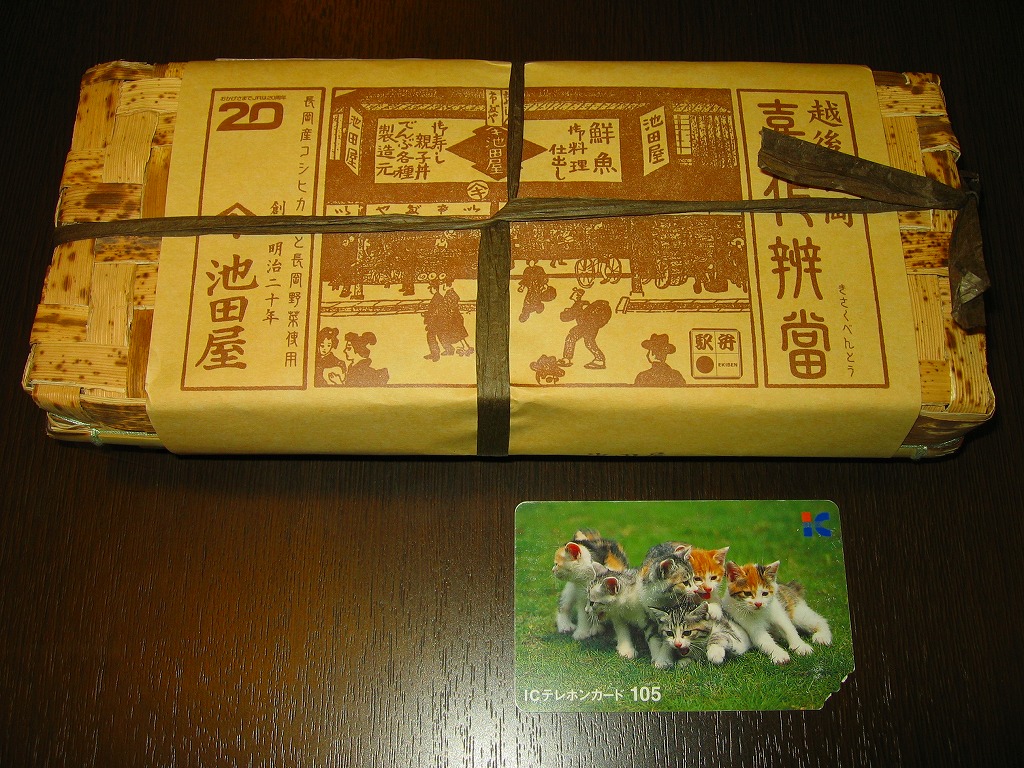上記の駅弁「越後長岡喜作辨當」の、2008(平成20)年時点の姿であり、その前年の発売時の姿。上記の2021年のものと比べて、掛紙にJR20周年のロゴマークがあり、容器は竹皮編みで、中身の鶏肉が肉団子でなく照焼やごぼう巻で、笹団子でなく桜餅が入り、価格がちょうど千円だった。雰囲気が変わるものではない。