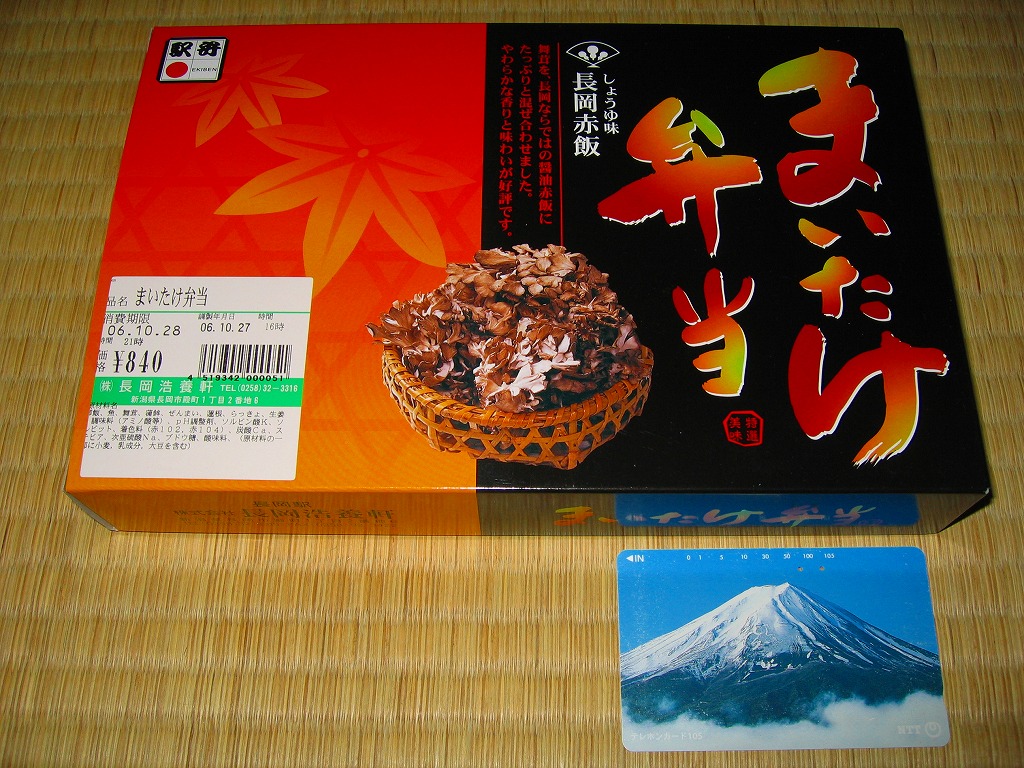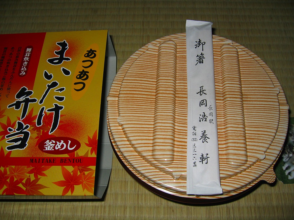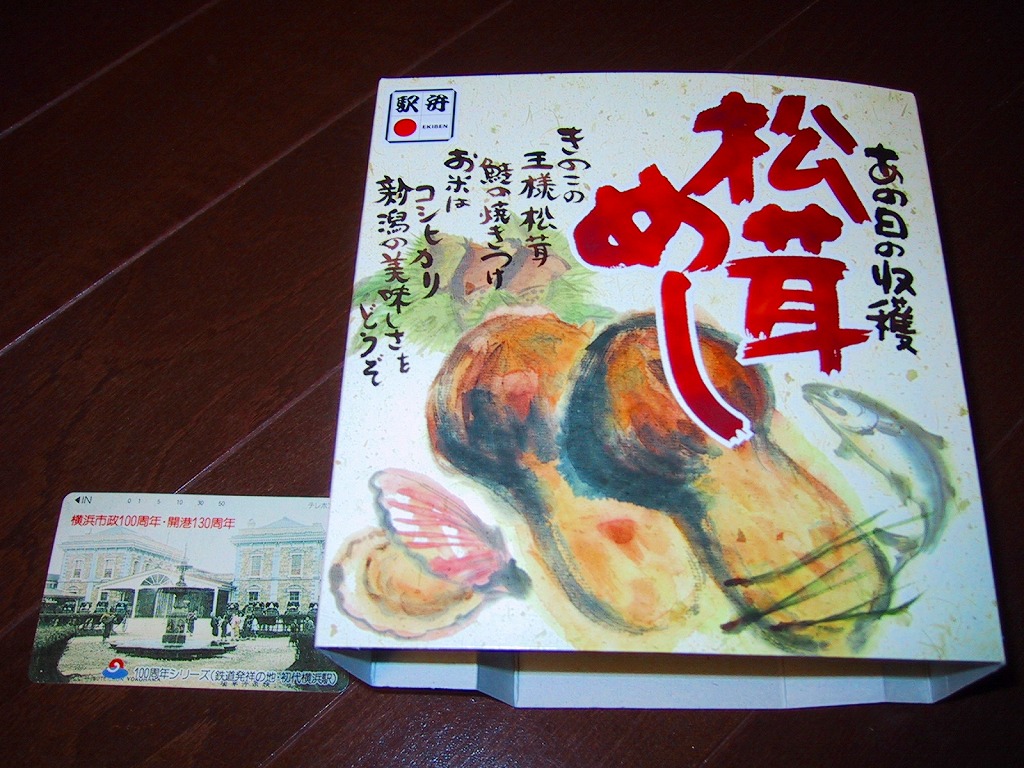 ずいぶんとしなる円形のプラスティック容器をボール紙のパッケージにはめる。中身は御飯の上に平面をなさないほど薄い松茸が数切れなど載るごく普通の松茸駅弁ではあるが、ホタテにイクラにゼンマイなどの山菜、そしてやっぱり美味な鮭の焼き付けにお米は当然コシヒカリ。松茸と意識しなければなかなか優れた駅弁だ。しかしこの駅弁は、2009年6月の調製元の事業停止により失われた。
