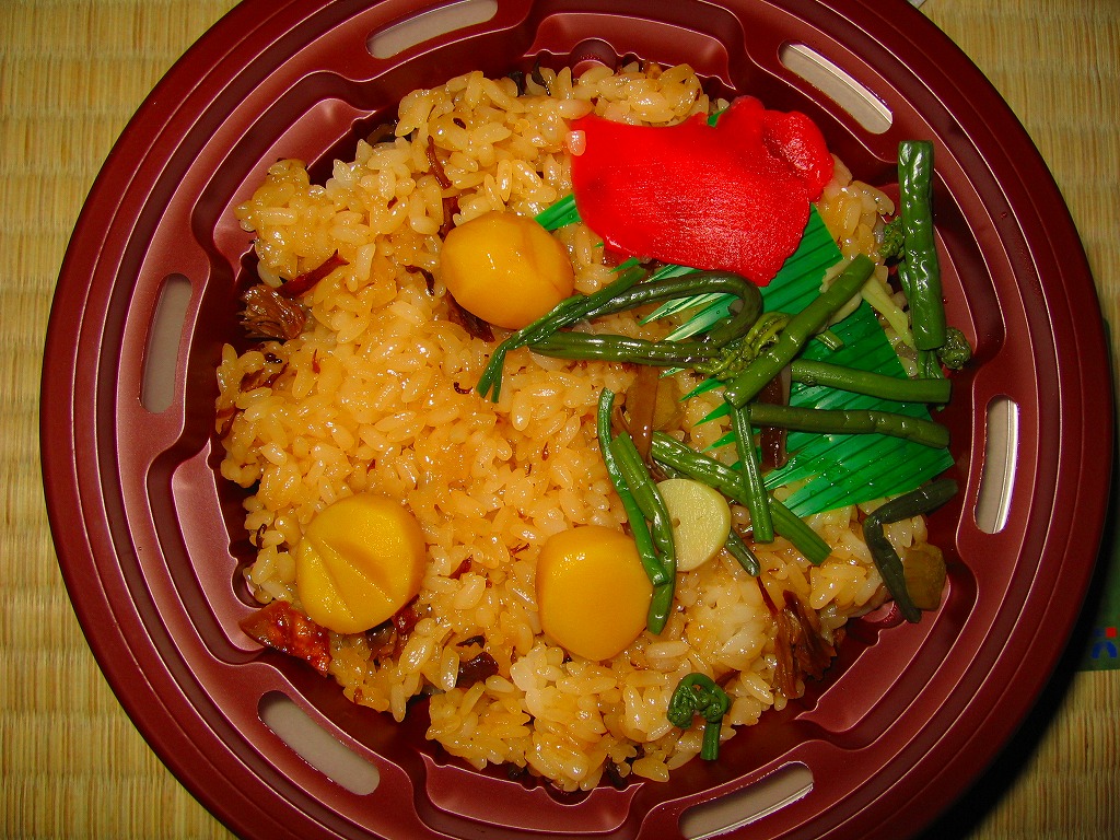 秋冬の駅弁大会シーズンに向けた、2004(平成16)年秋の新商品か。円形の加熱機能付き容器を、紅葉と舞茸の駅弁大会で生えそうなパッケージに収める。中身は舞茸混じりの醤油おこわに栗と山菜を添えるもの。つまり御飯をひたすら食べる駅弁だが、それがいい味を出しており、加熱式駅弁の常で少量なこともあり、一気に食べられる。舞茸が載らない舞茸駅弁は比較的珍しいと思う。